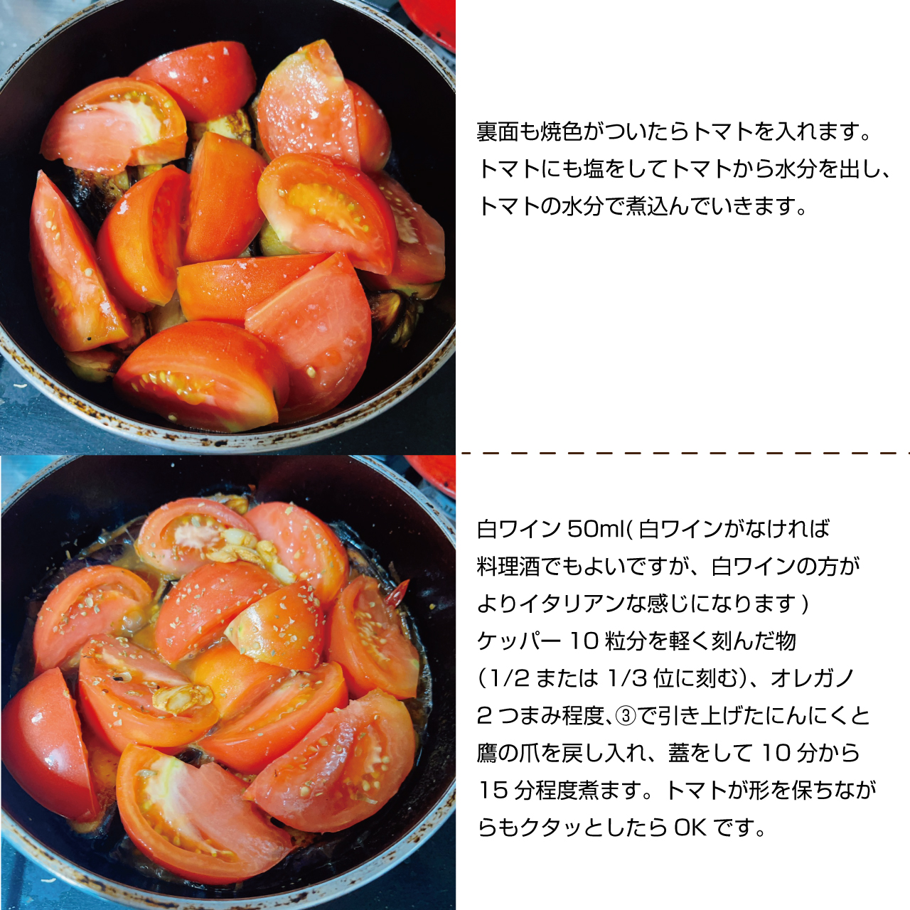 ⑤白ワイン50ml(白ワインがなければ料理酒でもよいですが、白ワインの方がよりイタリアンな感じになります)、ケッパー10粒分を軽く刻んだ物(1/2または1/3位に刻む)、オレガノ2つまみ程度、③で引き上げたにんにくと鷹の爪を戻し入れ、蓋をして10分から15分程度煮ます。トマトが形を保ちながらもクタッとしたらOKです。