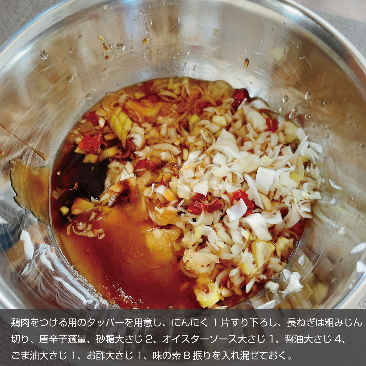 ①鶏肉をつける用のタッパーを用意し、にんにくの皮を剥き、すり下ろす。長ねぎはジャバラ切りからの粗みじん切り、輪切り唐辛子適量、砂糖大さじ2、オイスターソース大さじ1、醤油大さじ4、ごま油大さじ1、お酢大さじ1、味の素8振りを入れ混ぜる。