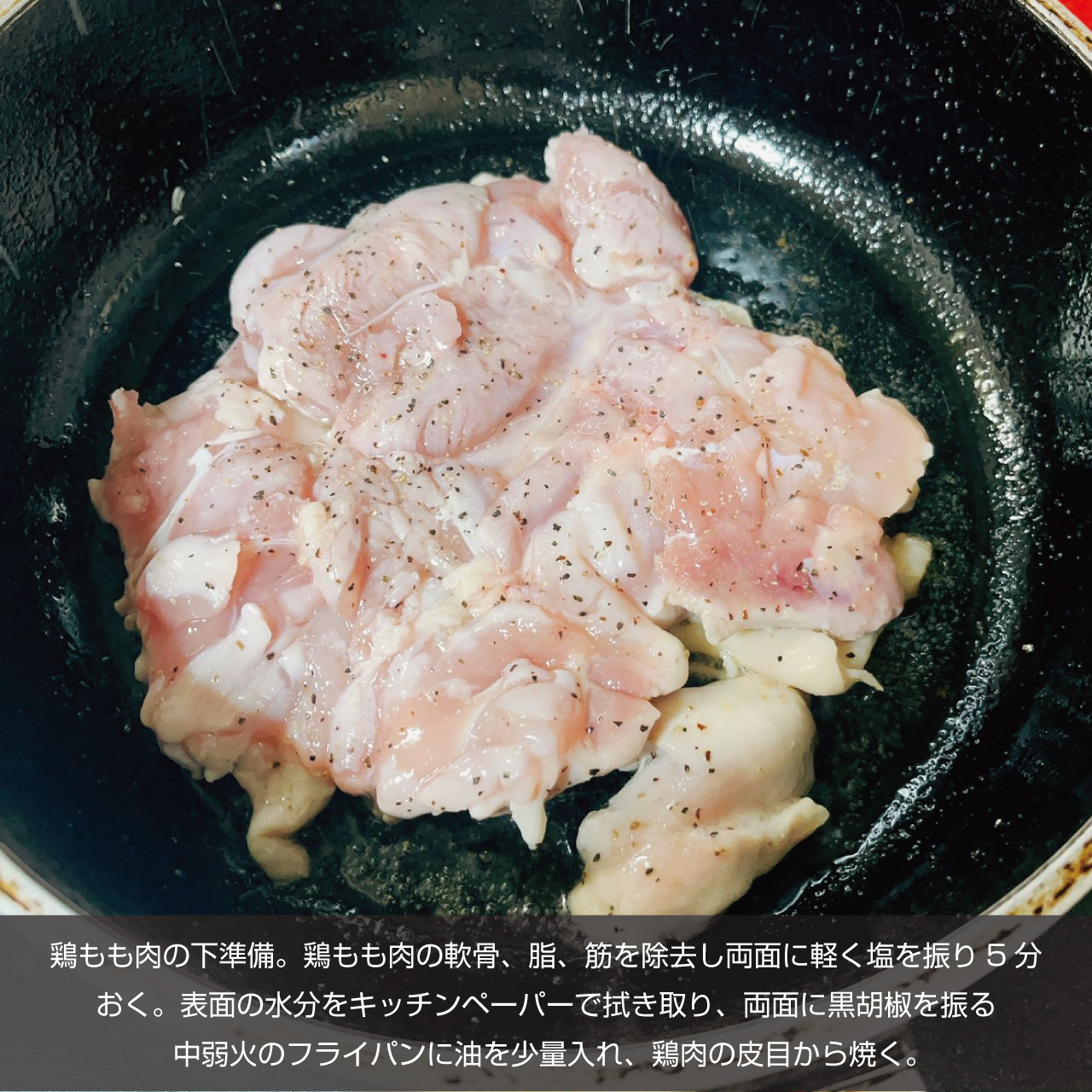 ②鶏もも肉の下準備。鶏もも肉の軟骨、脂、筋を除去し両面に軽く塩を振り5分おく。表面の水分をキッチンペーパーで拭き取り、両面に黒胡椒を振る。中弱火のフライパンに油を少量入れ、鶏肉の皮目から焼く。