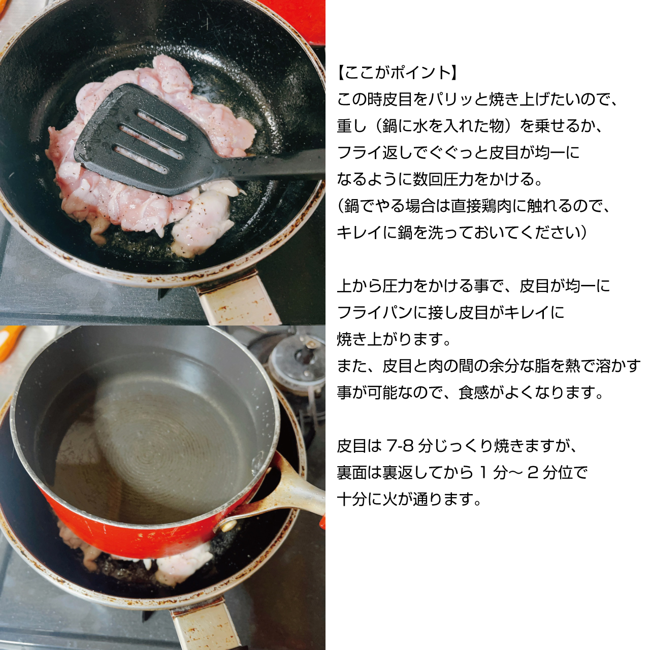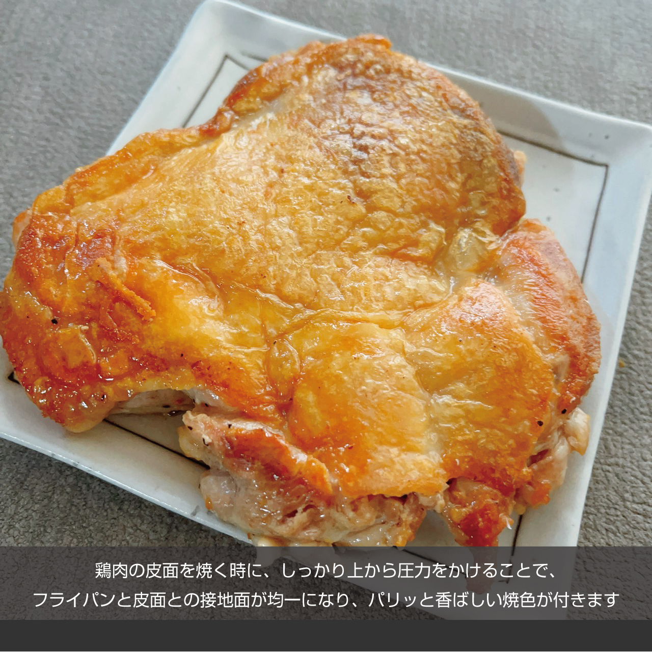 上から圧力をかける事で、皮目が均一にフライパンに接し皮目がキレイに焼き上がります。また、皮目と肉の間の余分な脂を熱で溶かす事が可能なので、食感がよくなります。
