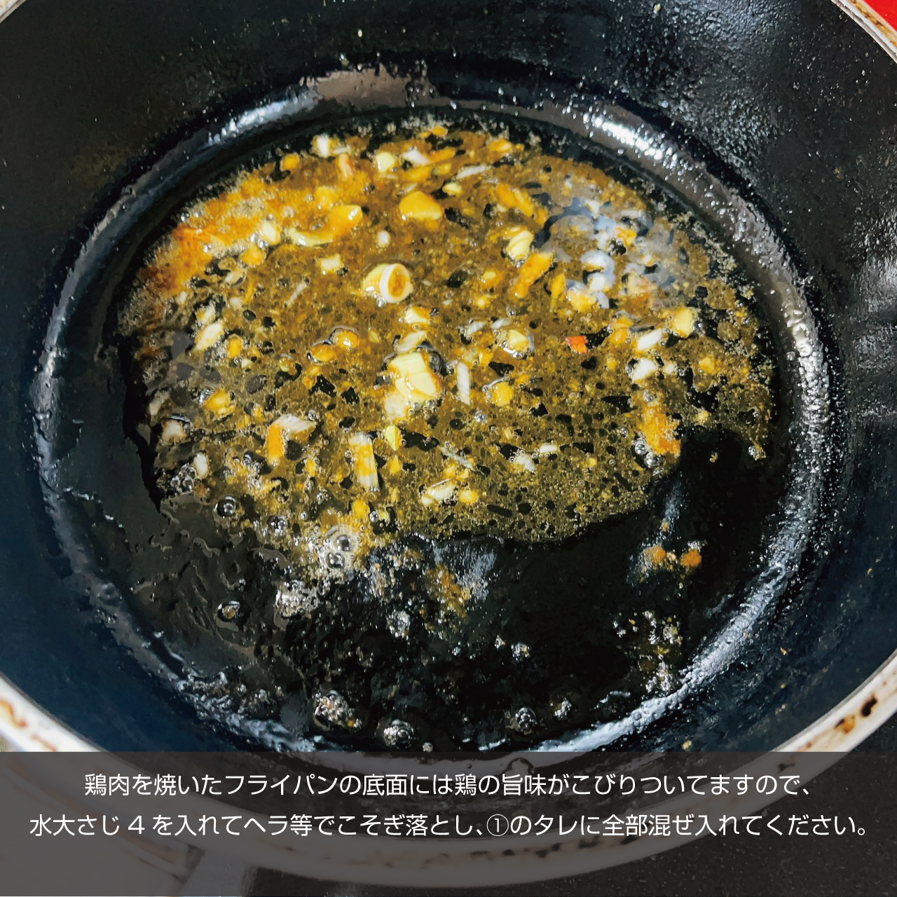 ④鶏肉を焼いたフライパンの底面には鶏の旨味がひっついてますので、水大さじ4を入れてヘラ等でこそぎ落とし、①のタレに全部混ぜ入れてください。