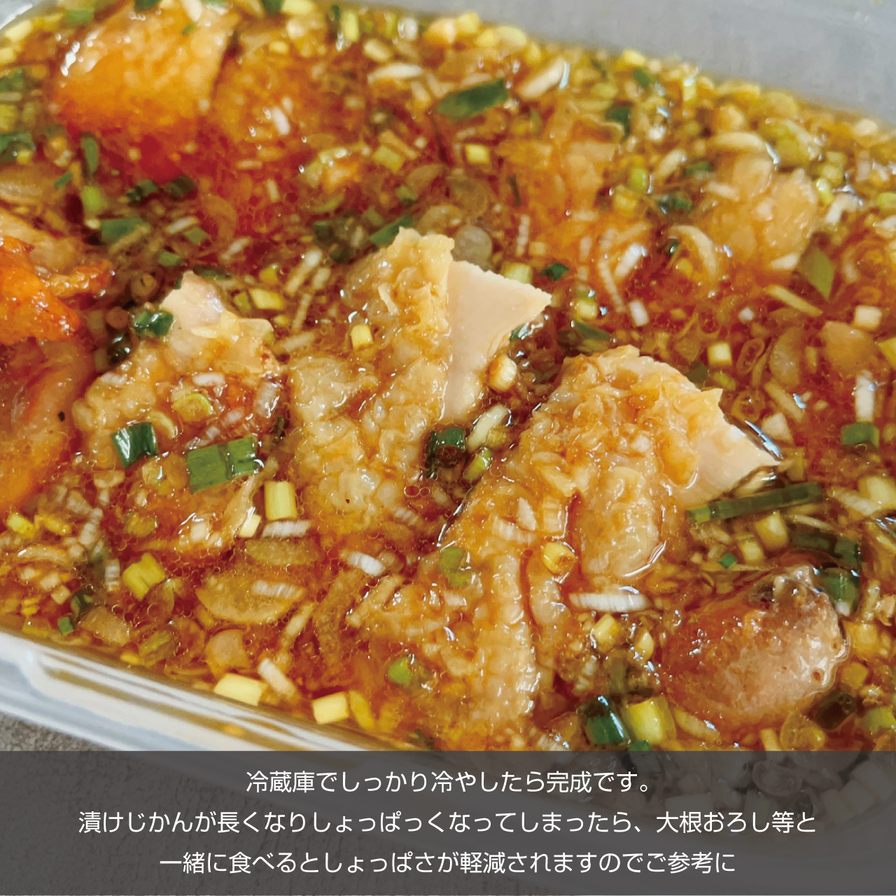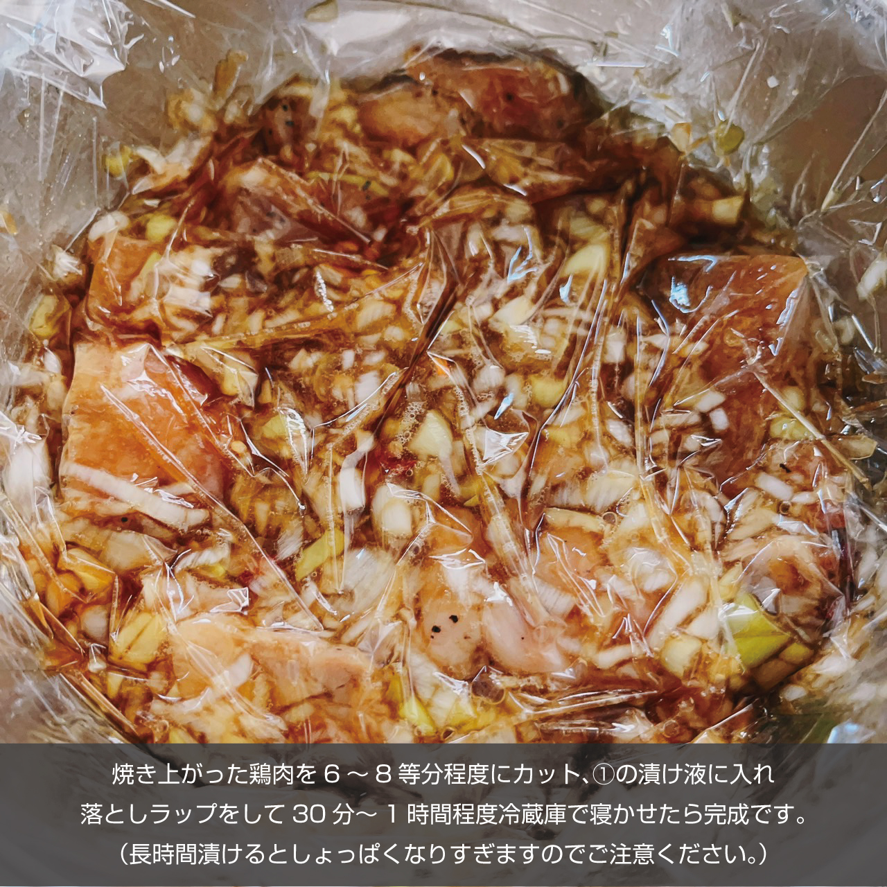 ⑤ 焼き上がった鶏肉を6~8等分程度に切り分け(皮目を下にすると切りやすいです。皮目を上にして切ると皮だけ取れちゃいますのでご注意ください)①の漬け液に入れ落としラップをして30分~1時間程度冷蔵庫で寝かせたら完成です。(1時間以上漬けるとタレの塩分濃度が高くしょっぱくなりすぎますのでご注意ください。)