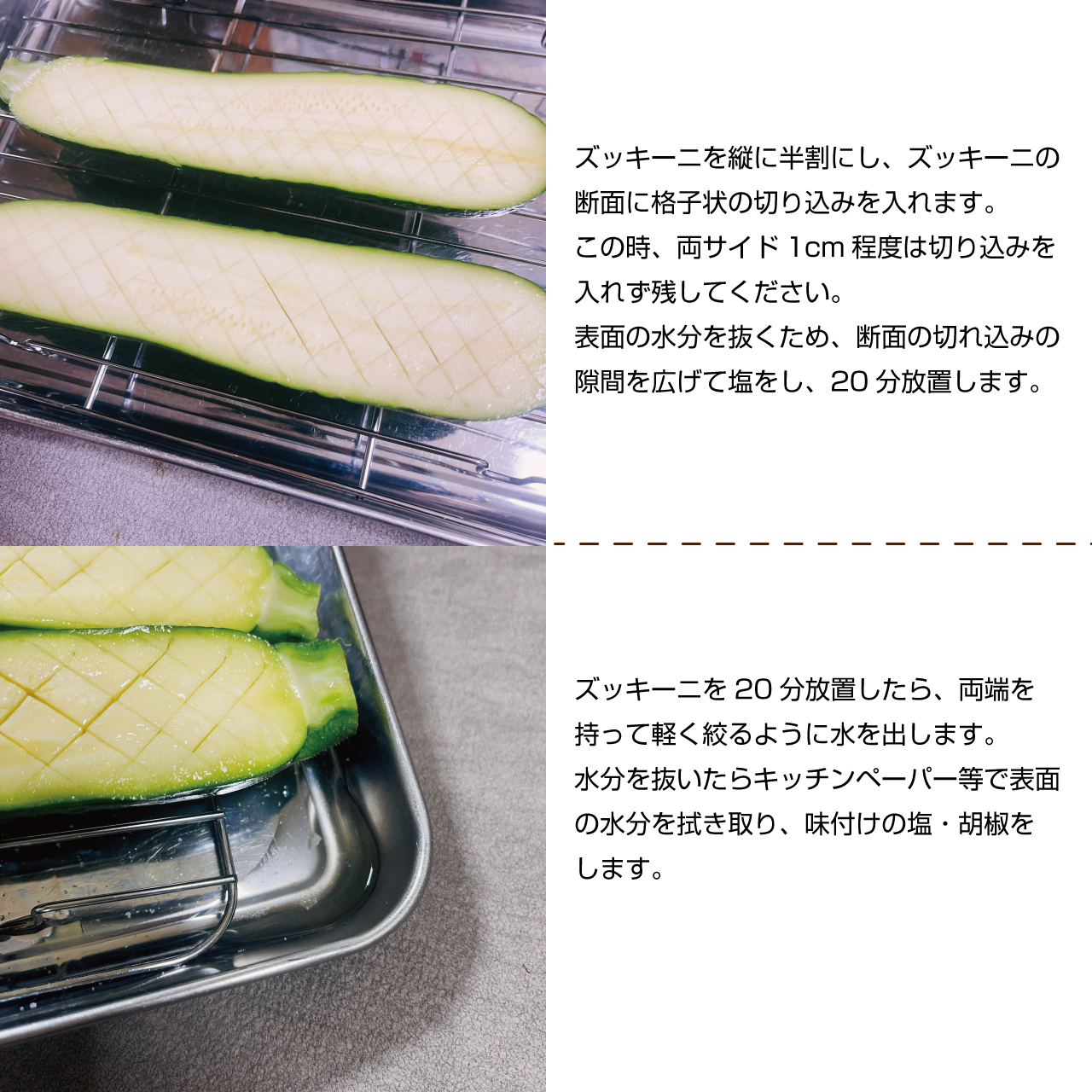 ①ズッキーニを縦に半割にし、ズッキーニの断面に格子状の切り込みを入れます。この時、両サイド1cm程度は切り込みを入れず残してください。