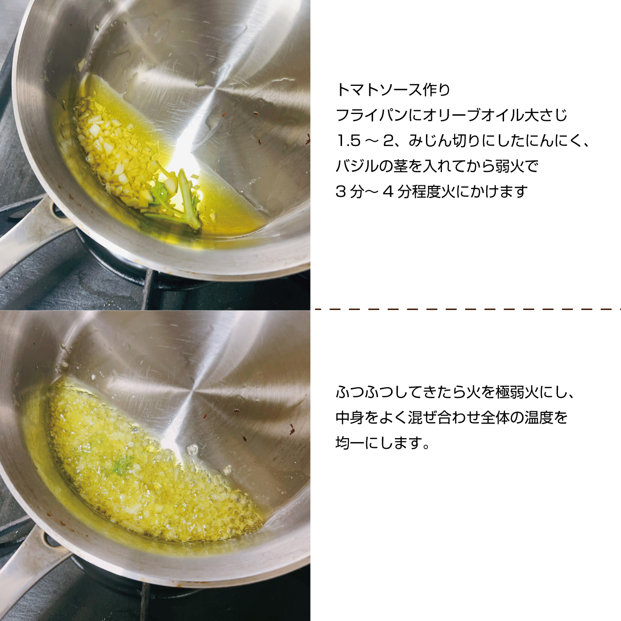 ②トマトソース作り フライパンにオリーブオイル大さじ1.5~2、みじん切りにしたにんにく、バジルの茎を入れてから弱火で3分~4分程度火にかけます