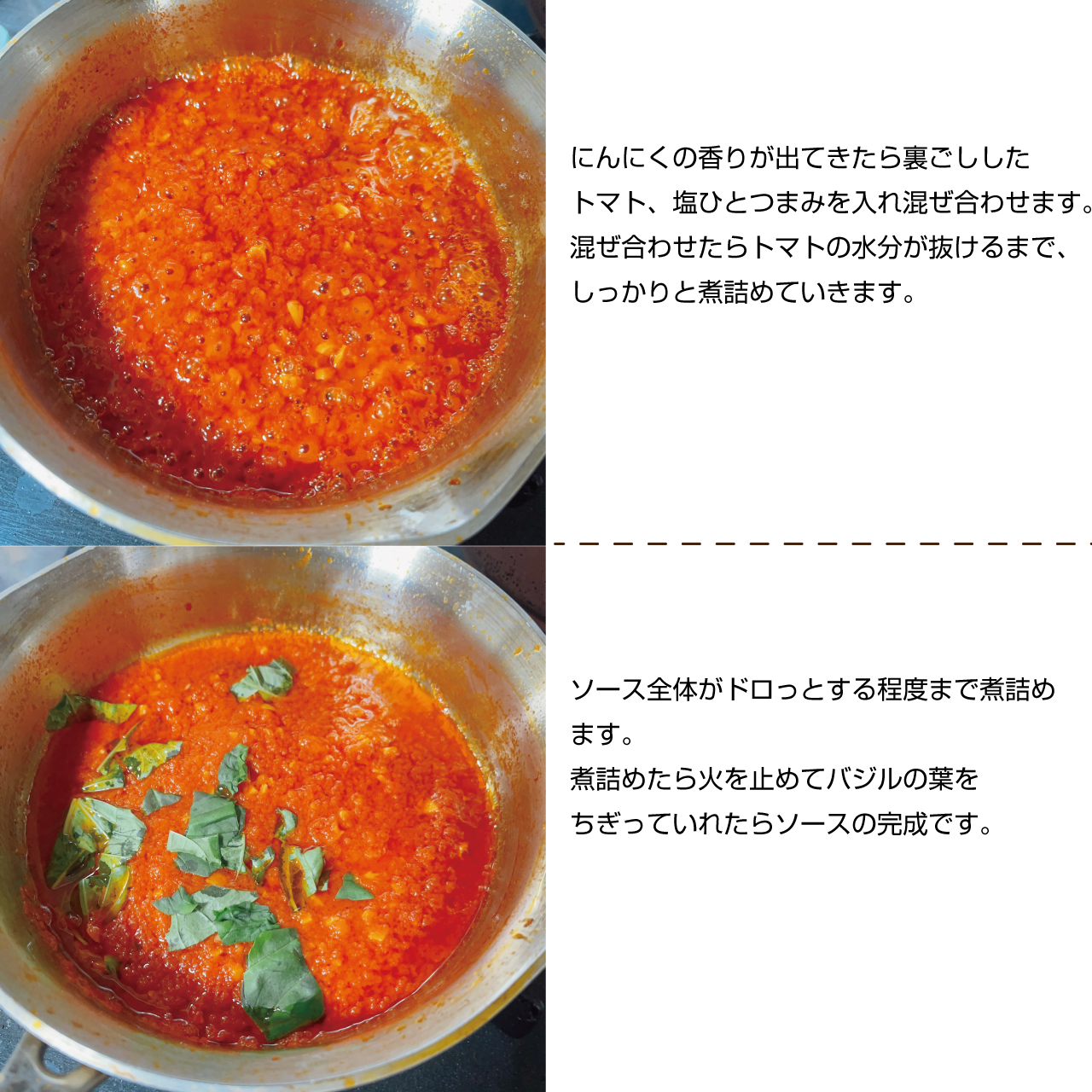 ます。煮詰めたら火を止めてバジルの葉をちぎっていれたらソースの完成です。