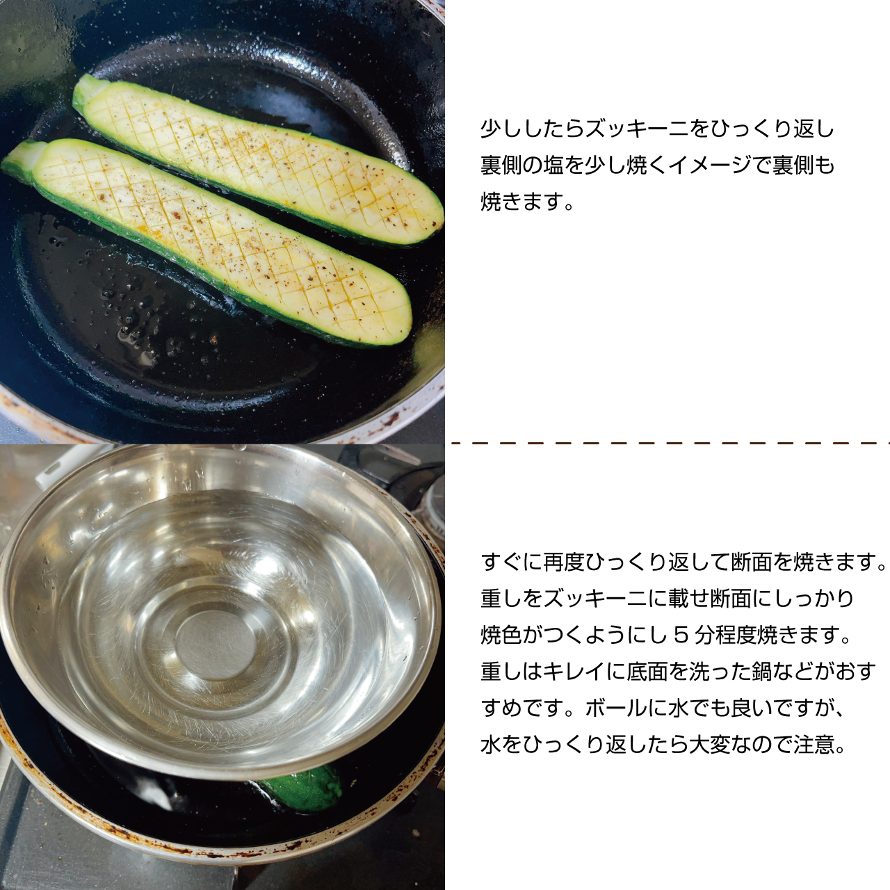 ⑤断面に綺麗な焼色がついたら、ひっくり返し裏側を2分程度焼きます(ズッキーニは生食可能な野菜なので裏面は焼色をつけなくてもOKです。)