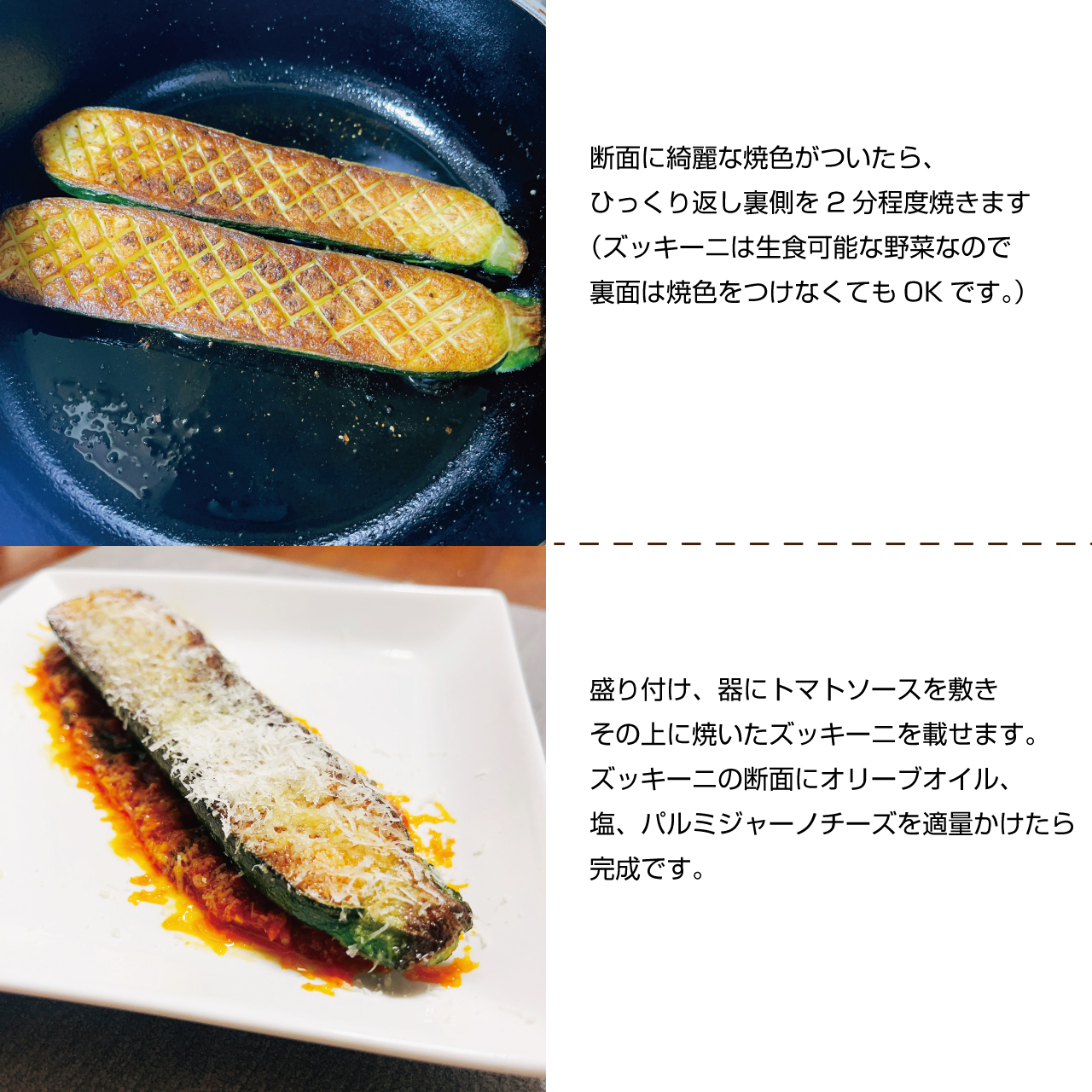 ⑥盛り付け、器にトマトソースを敷きその上に焼いたズッキーニを載せます。ズッキーニの断面にオリーブオイル、塩、パルミジャーノチーズ、適量かけたら完成です。
