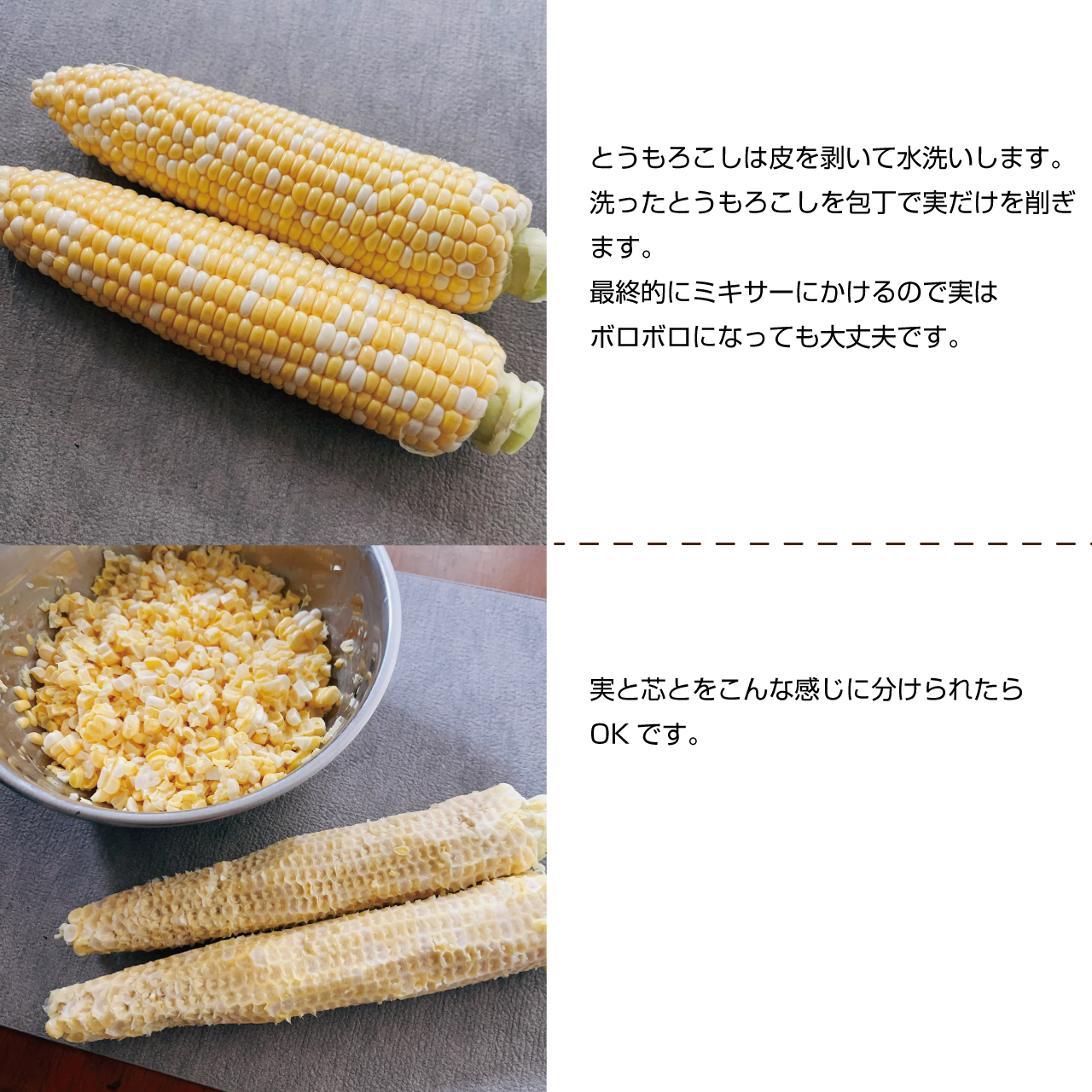 ①とうもろこしは皮を剥いて水洗いします。洗ったとうもろこしを包丁で実だけを削ぎます。実は最終的にミキサーにかけるのでボロボロになっても大丈夫です。
