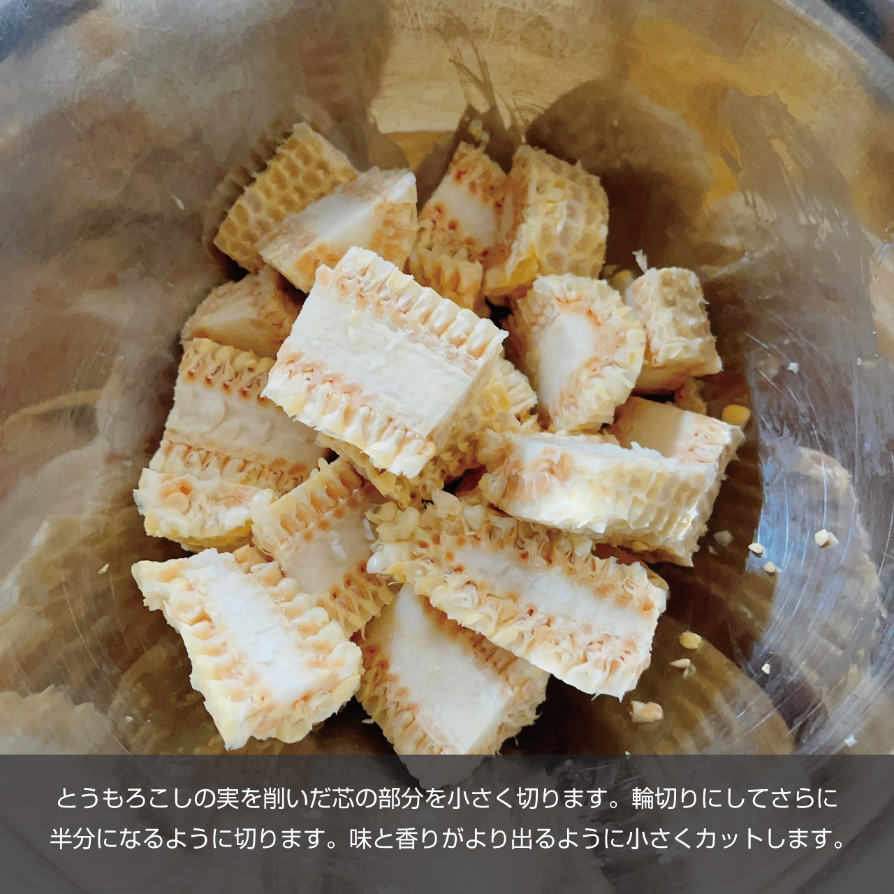 ②とうもろこしの実を削いだ芯の部分を小さく切ります。輪切りにしてさらに半分になるように切ります。味と香りがより出るように小さくカットします。