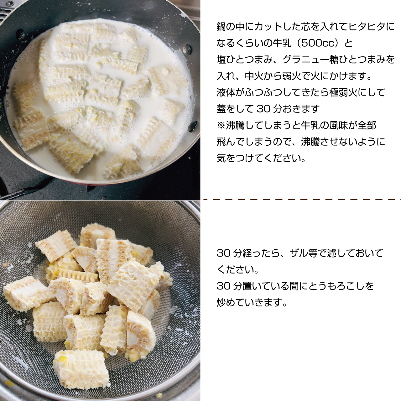 とうもろこしは身の部分と芯に分けるんですが、とうもろこしの芯を牛乳と合わせて低温で煮出す事でとうもろこしの味と風味が牛乳に移りこれがまー美味しい訳なんです。