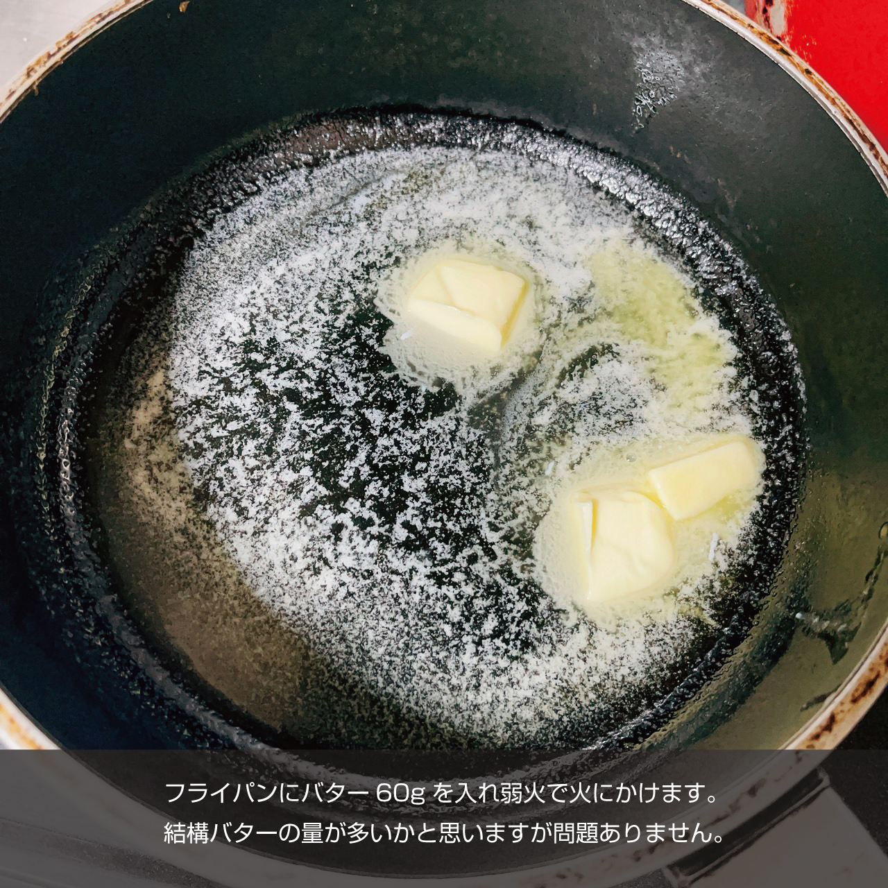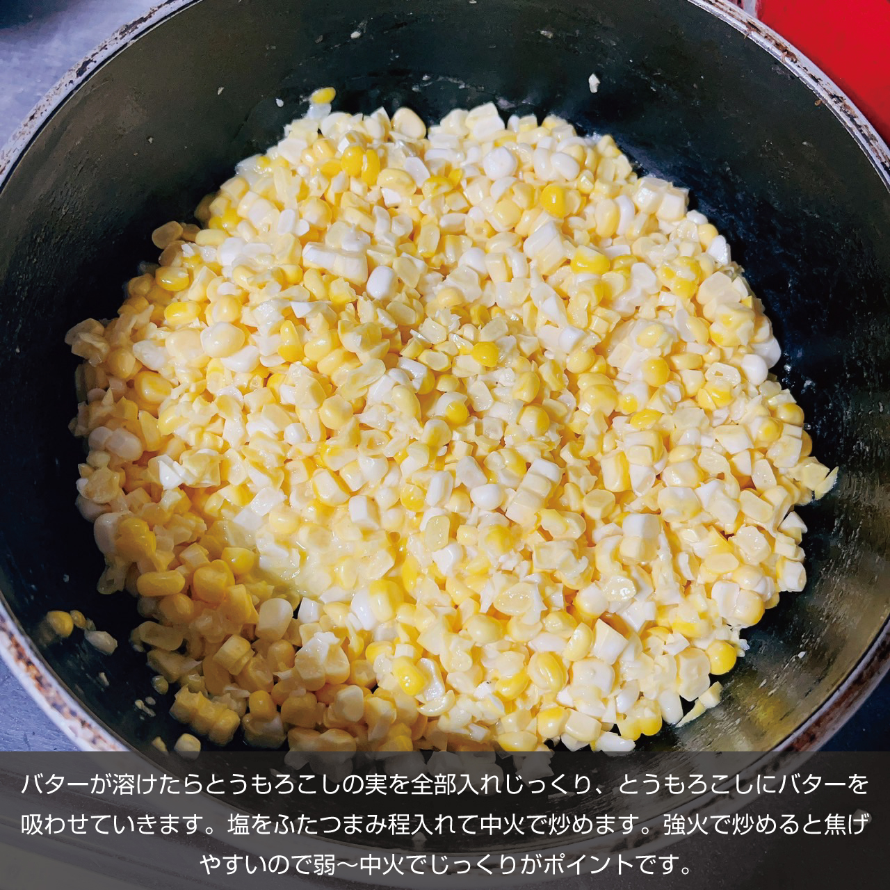 ④フライパンにバター60gを入れ弱火で火にかけます。結構バターの量が多いかと思いますが問題ありません。バターが溶けたらとうもろこしの実を全部入れじっくり、とうもろこ