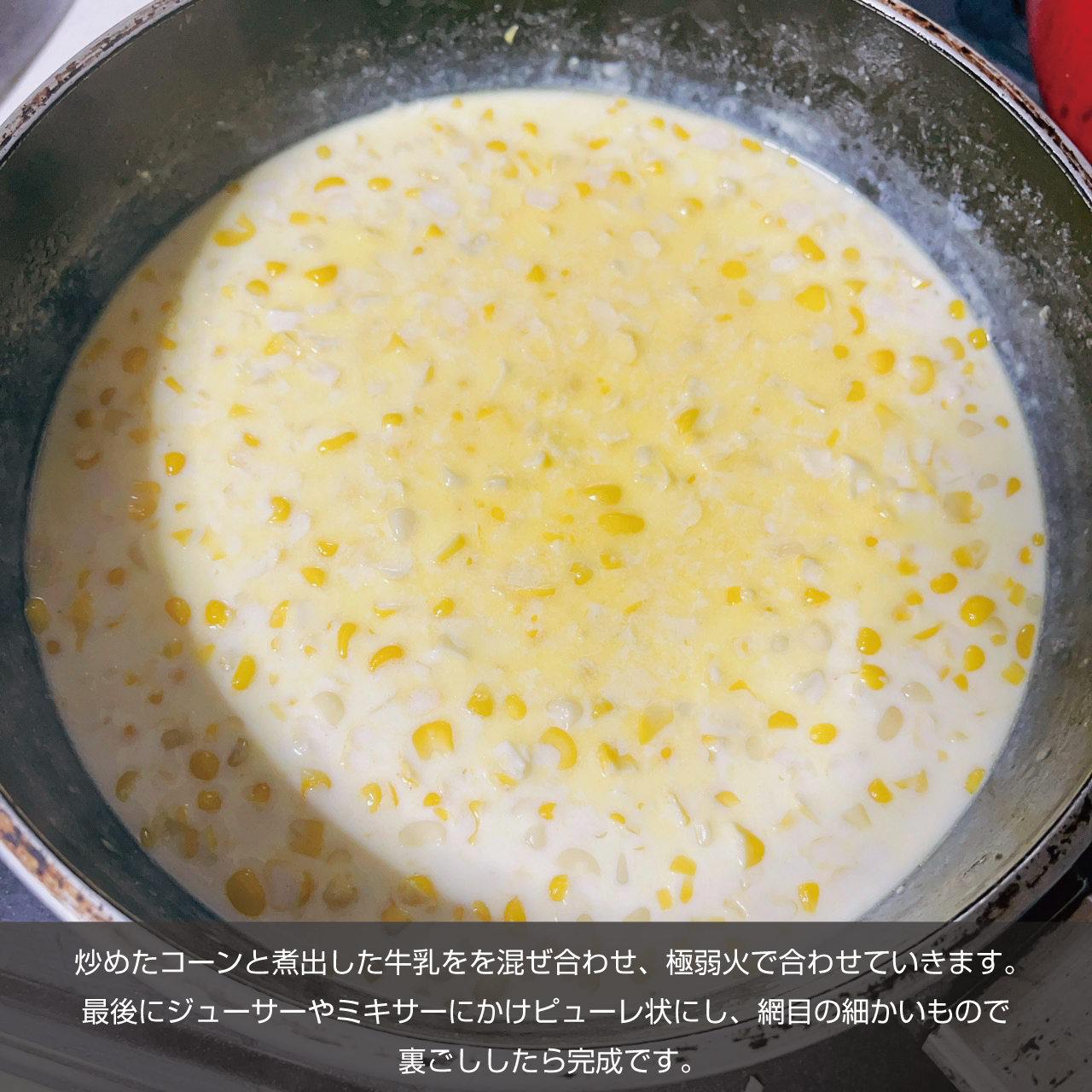 ⑥ ④で炒めたとうもろこしに⑤の牛乳を入れて極弱火で混ぜながら10分程合わせます。味見をして塩が足りなければ調整してください。