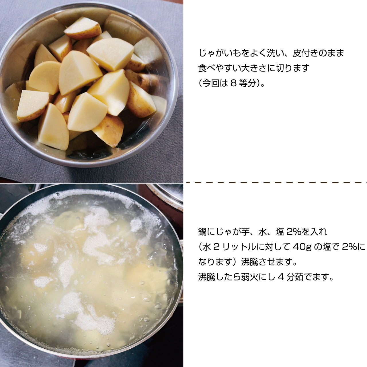 ①じゃがいもをよく洗い、皮付きのまま食べやすい大きさに切ります(今回は8等分)。鍋にじゃが芋、水、塩2%を入れ(水2リットルに対して40gの塩で2%になります)沸騰させます。沸騰したら弱火にし4分茹でます。ざる等に上げて水気をペーパー等でしっかり拭き取ります。ここで丁寧に水気を取っておくことで、焼いた時に焼色が付きやすくなります。