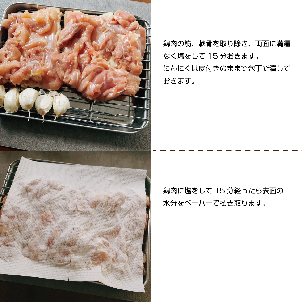 ②鶏肉の筋、軟骨を取り除き、両面に満遍なく塩をして15分おきます。にんにくは皮付きのままで包丁で潰しておきます。鶏肉に塩をして15分経ったら表面の水分をペーパーで拭き取ります。