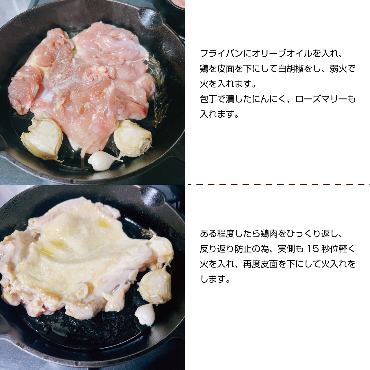 ③フライパンにオリーブオイルを入れ、鶏を皮面を下にして白胡椒をし、弱火で火を入れます。包丁で潰したにんにく、ローズマリーも入れます。ある程度したら鶏肉をひっくり返し反り返り防止の為実側も15秒位軽く火を入れ、再度皮面を下にして火入れします。