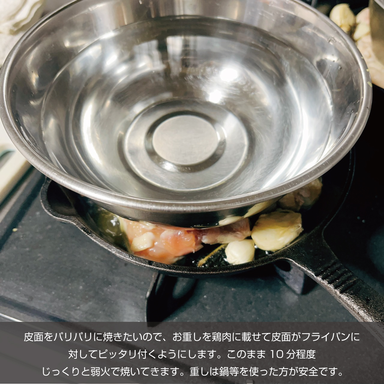 ④皮面をパリパリに焼きたいので、お重しを鶏肉に載せて皮面がフライパンに対してピッタリ付くようにします。このまま10分程度じっくりと弱火で焼いてきます。