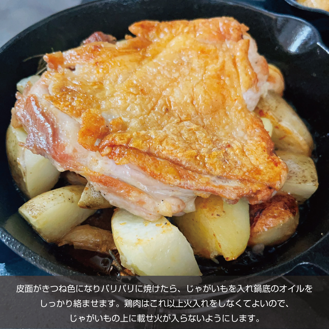 ⑤皮面がきつね色になりパリパリに焼けたら、じゃがいもを入れ鍋底のオイルをしっかり絡ませます。鶏肉はこれ以上火入れをしなくてよいので、じゃがいもの上に載せ火が入らないようにします。鶏肉から出たオイルを逃さずじゃがいもにまとわせる事でじゃがいもがめちゃくちゃ美味しくなります。じゃがいもに焼色がついたら完成です。