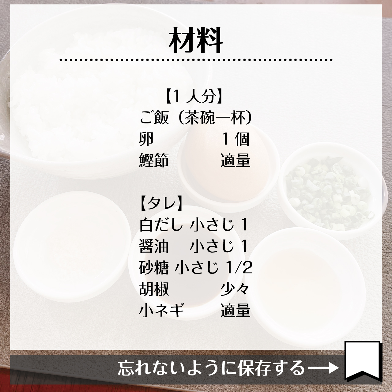 卵と醤油とご飯だけの卵かけご飯も美味しいですが、タレを作り、鰹節、小ねぎでワンランク上の卵かけご飯になります。