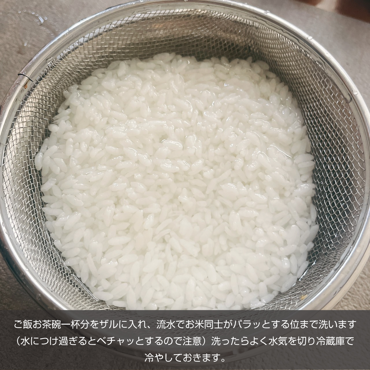 ①ご飯お茶碗一杯分をザルに入れ、流水でお米同士がパラッとする位まで洗います(水につけ過ぎるとベチャッとするので注意)洗ったらよく水気を切り冷蔵庫で冷やしておきます。