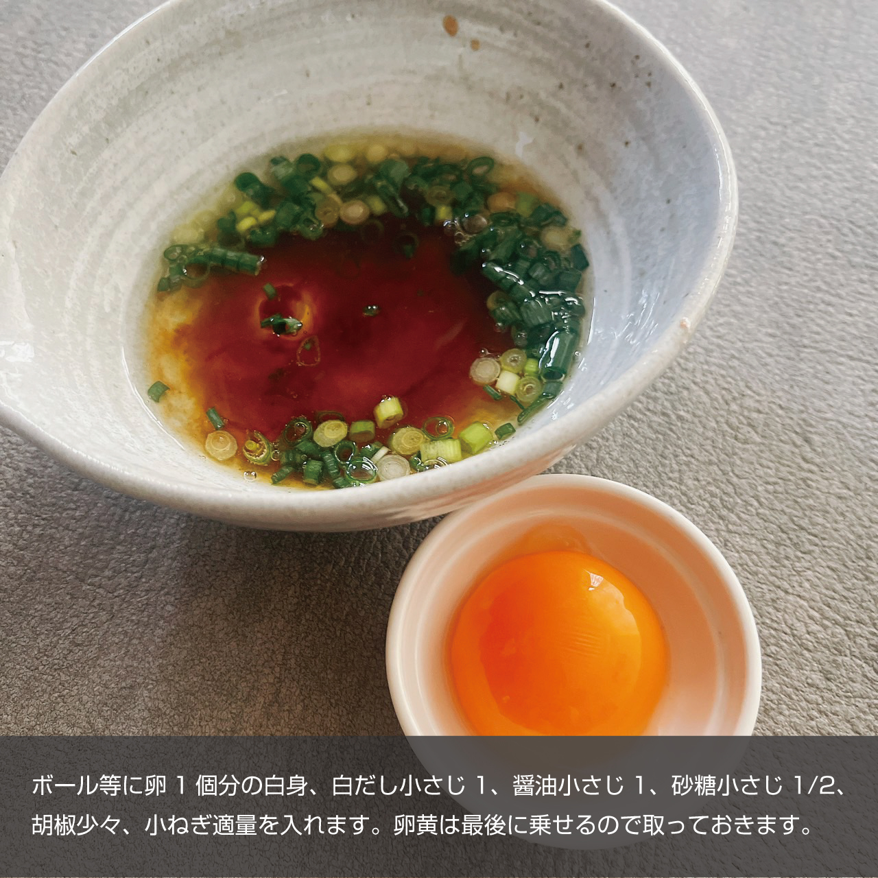 ②ボール等に卵1個分の白身、白だし小さじ1、醤油小さじ1、砂糖小さじ1/2、胡椒少々、小ねぎ適量を入れホイッパーで白身のデロデロ感がなくなるくらいまでしっかりまぜあわせます。