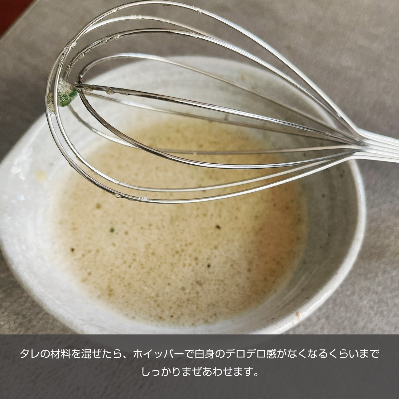 タレの材料と白身を混ぜたらホイッパーでしっかりかき混ぜ、白身のデロデロ感を除去してください。