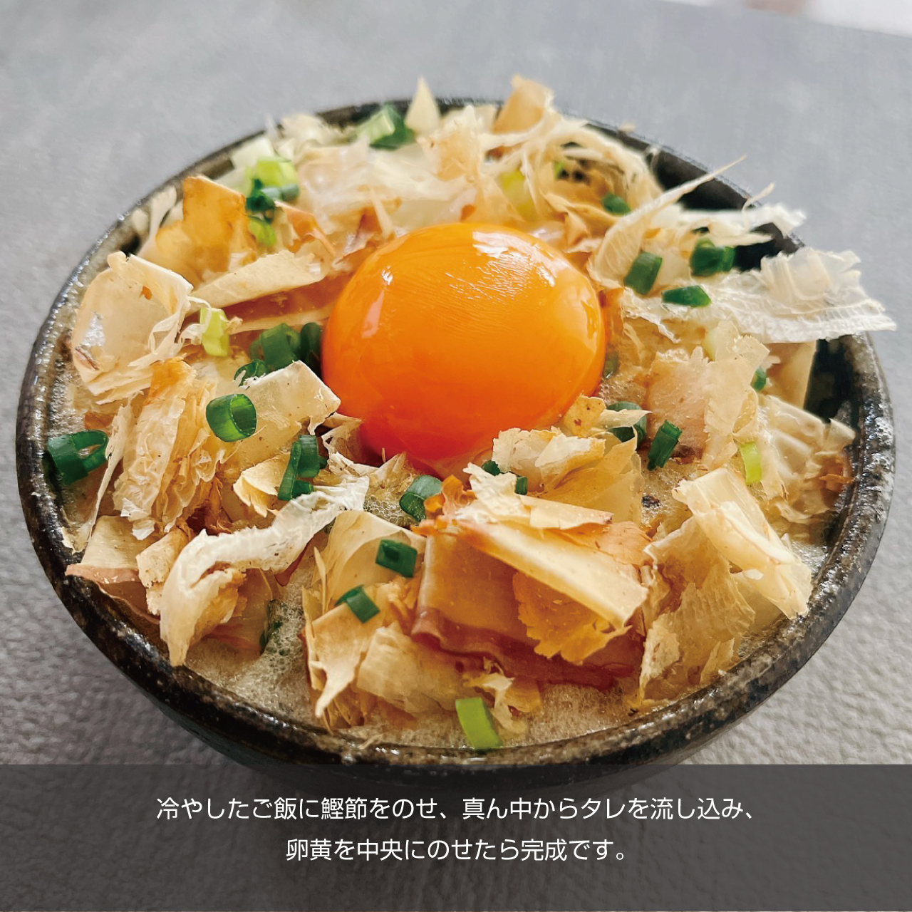 ③冷やしたご飯に鰹節をのせ、真ん中からタレを流し込み、卵黄を中央にのせたら完成です。