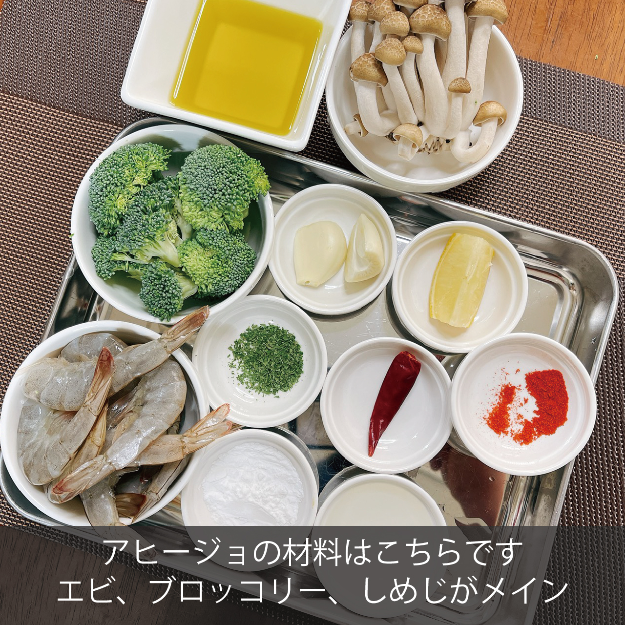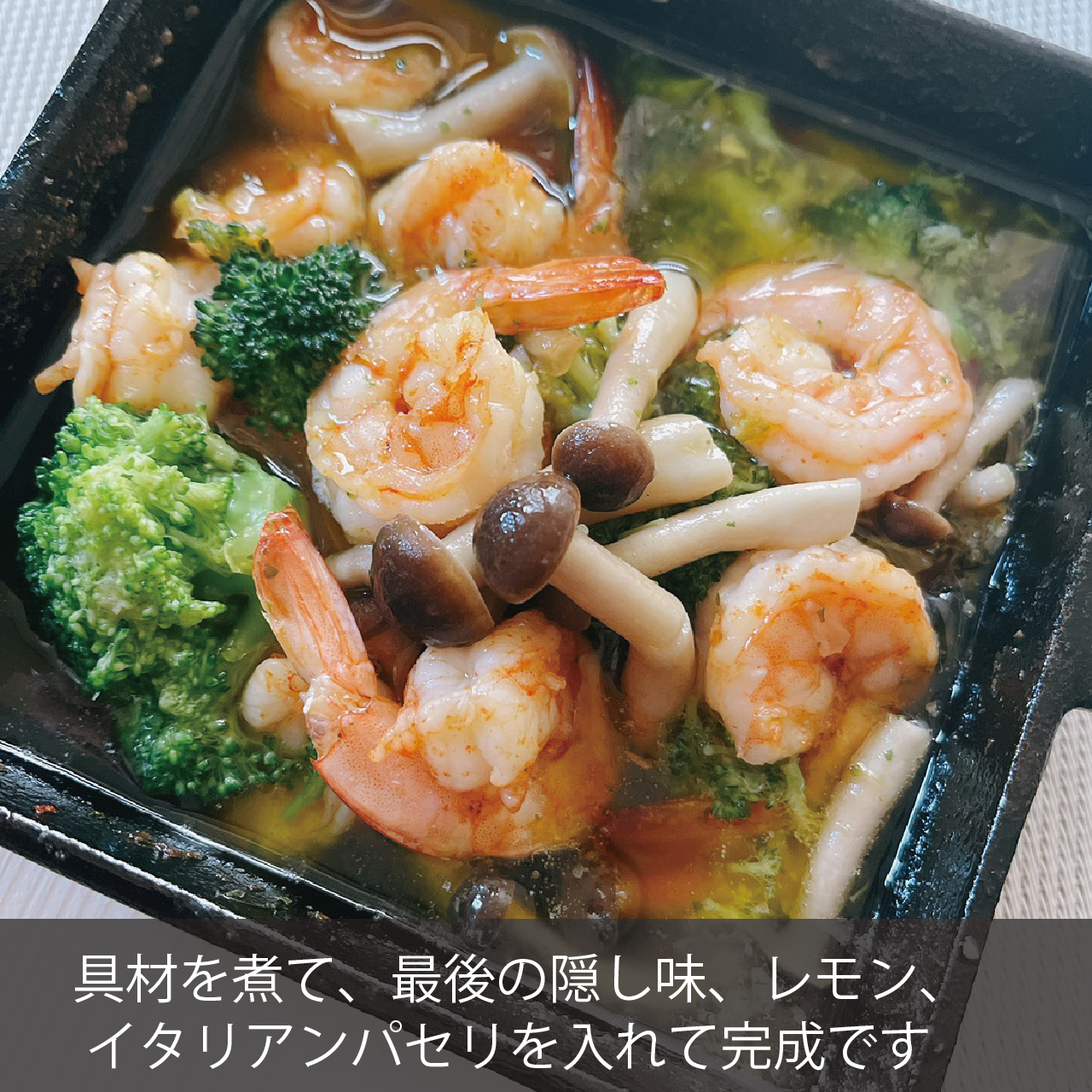 エビ、ブロッコリー、しめじの材料にしっかり下味の塩を振っていく事、この2点がアヒージョ作りのポイントになります。