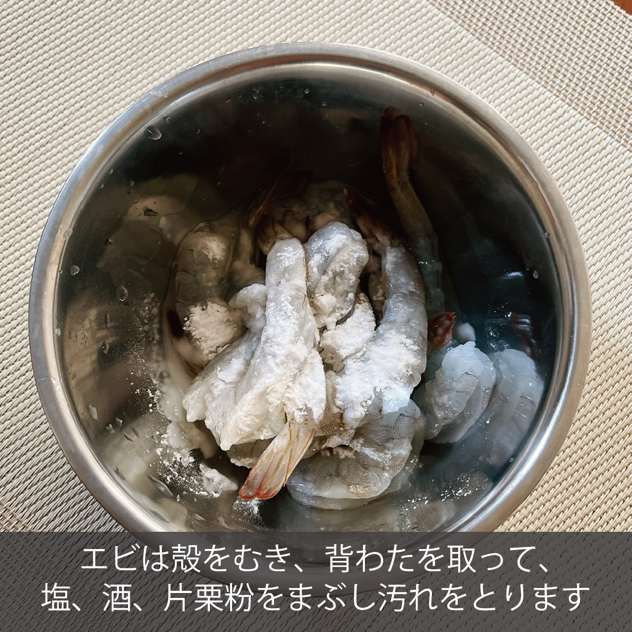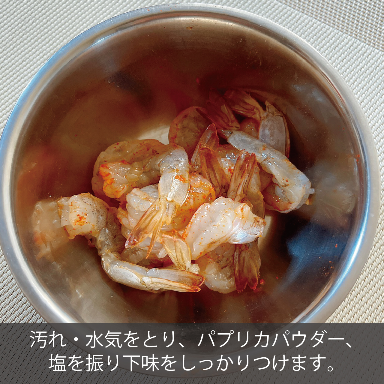 ❶エビの下処理 エビの殻(尻尾は残す)をむき、背ワタを取ります。その後、塩、酒、片栗粉を混ぜ合わせ汚れ、臭み、ぬめりを取り除きます。汚れが取れたら水洗いしてキッチンペーパーでしっかりと水気を取り、塩、パプリカパウダーをまぜ合わせ下味をつけます。