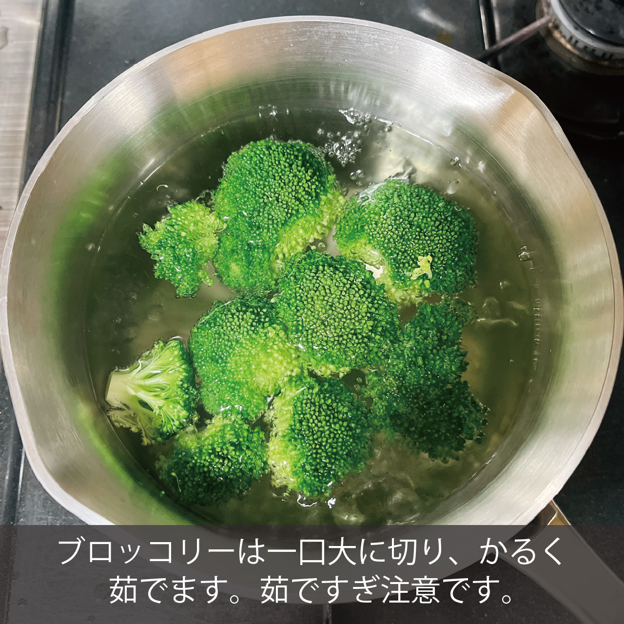 ❷ブロッコリーは一口大に切り、さっと茹で軽く塩をふります(後で煮るので硬さが残っている位でちょうどよいです。逆に茹ですぎは×です)しめじは石突を切り落とし軽く塩をふります、にんにくはみじん切りに、鷹の爪は種を取り除きます。