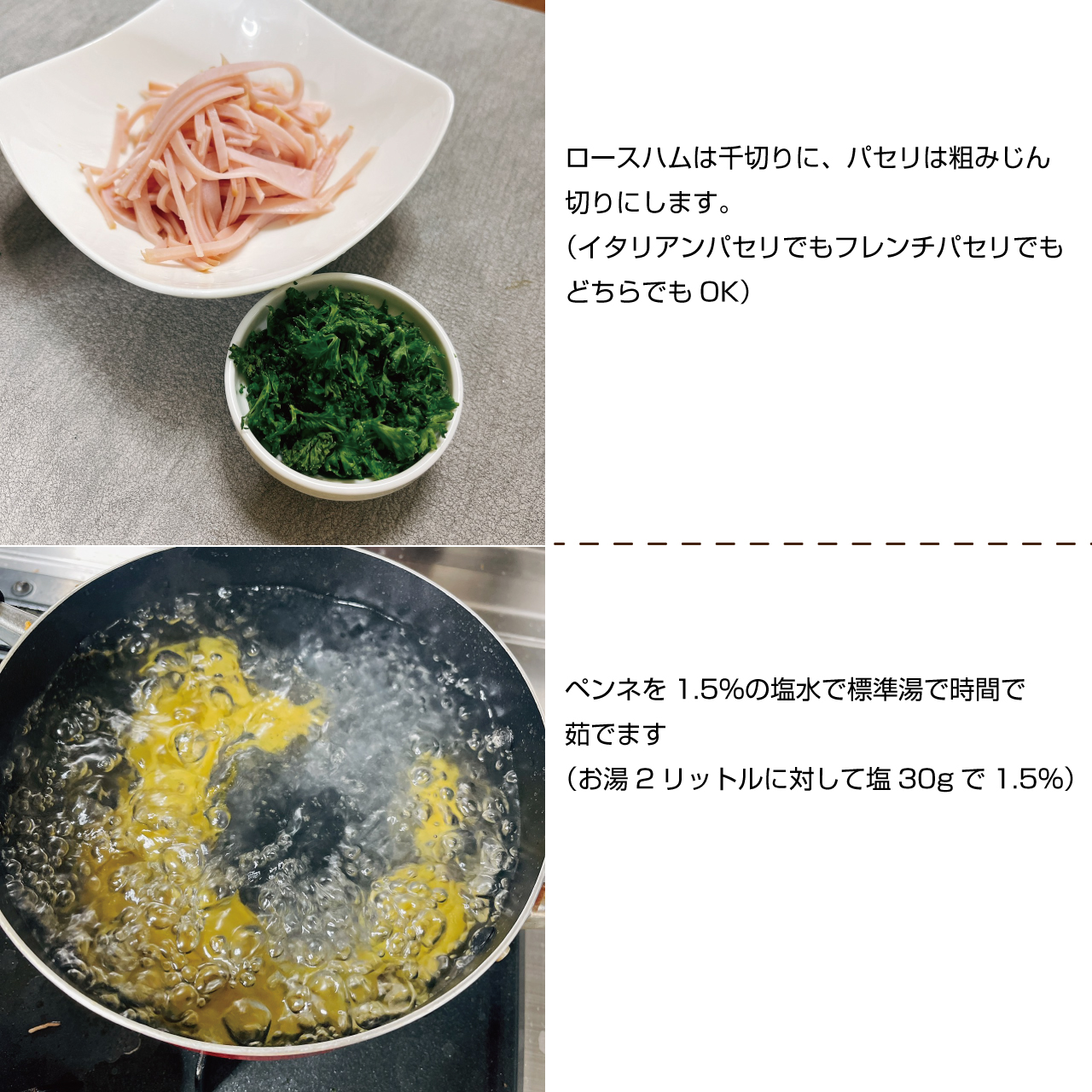 ①ロースハムは千切りに、パセリは粗みじん切りにします(イタリアンパセリでもフレンチパセリでもどちらでもOK)