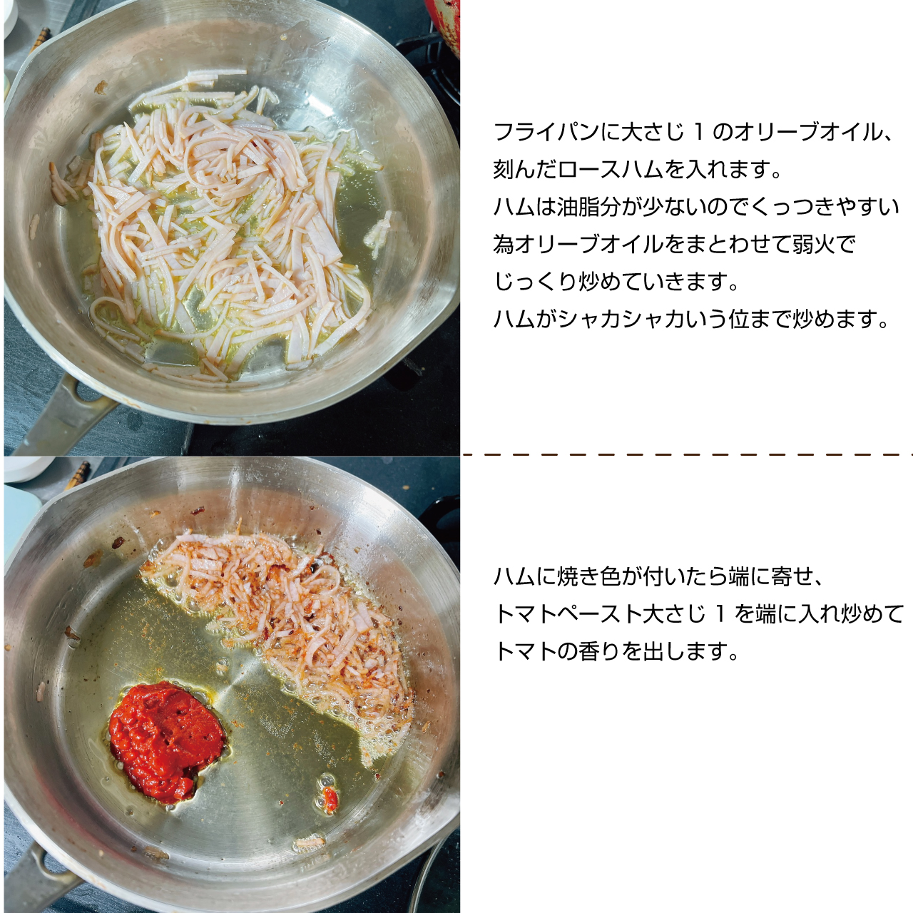 ロースハムじゃ旨味が足りないのでは?と思ったんですが、オリーブオイルでしっかり焼き色をつける事で、ハムの水分が飛び旨味が凝縮されます。トマトペーストも炒めて香りを出してから混ぜ合わせるので、トマト感もしっかり出ています。