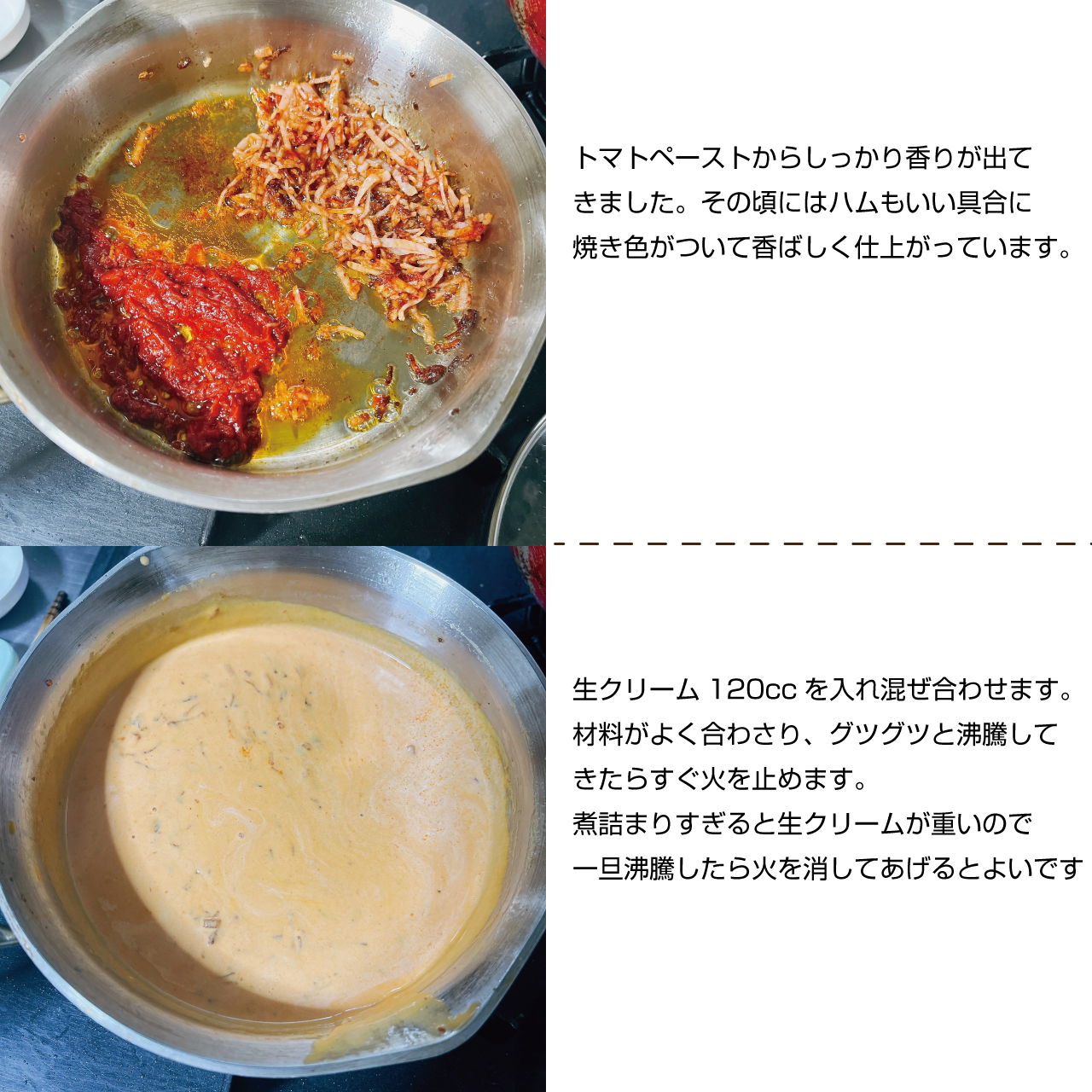 ④ハムに焼き色が付いたら端に寄せ、トマトペースト大さじ1を端に入れ炒めてトマトの香りを出します。香りが出たら生クリーム120ccを入れ混ぜ合わせます。