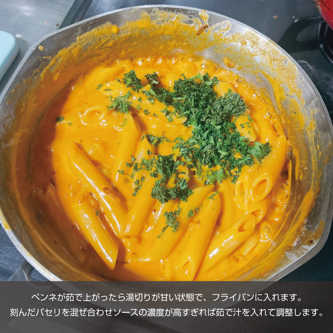 ⑥ペンネが茹で上がったら湯切りが甘い状態で、⑤のフライパンに入れます。刻んだパセリを混ぜ合わせソースの濃度が高すぎれば茹で汁を入れて調整します。