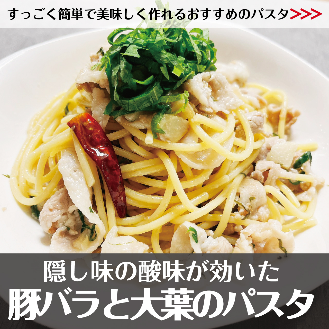 パスタで豚バラ肉を使うことってあまりないですが、豚バラ、大葉、にんにく、唐辛子とスーパーでも手に入りやすくすぐに作れるレシピです。