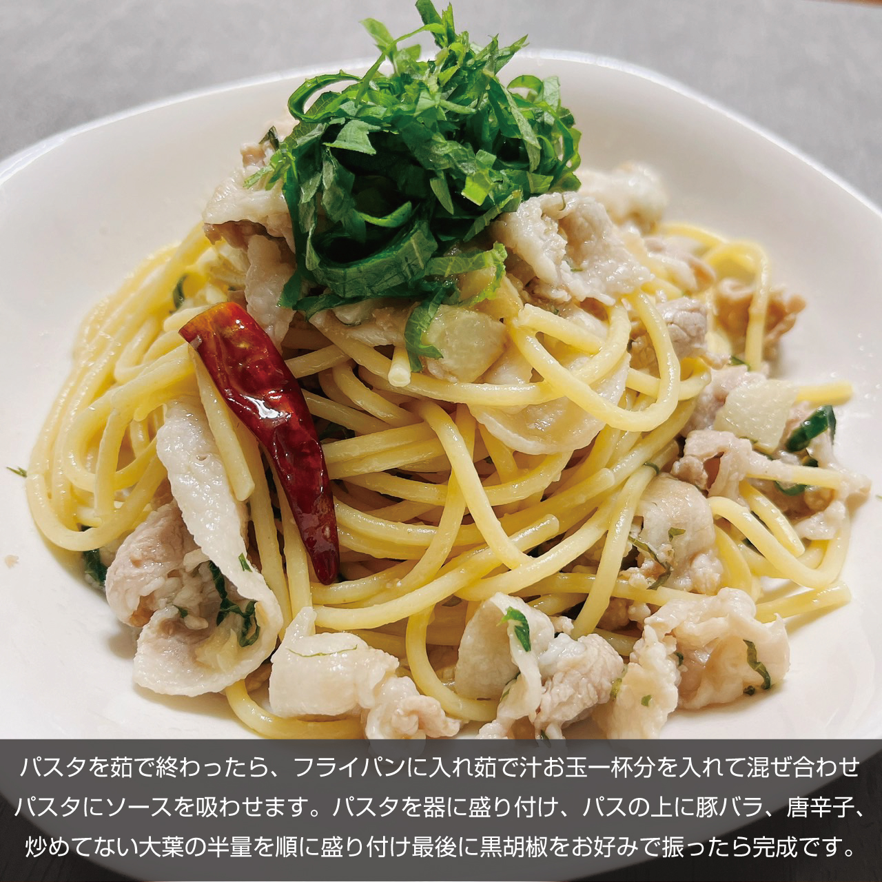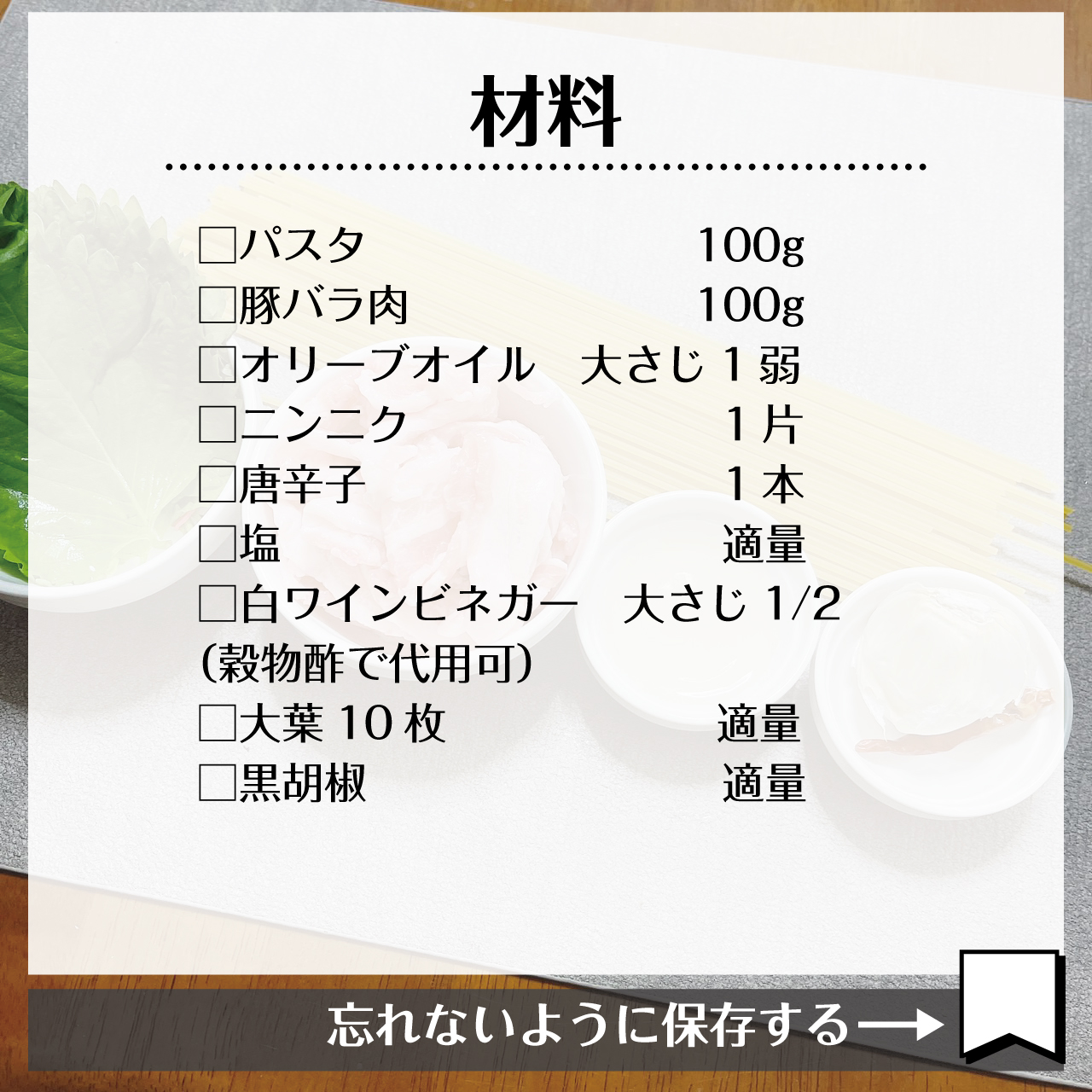 豚バラ肉、大葉、白ワインビネガーを使ったパスタです。