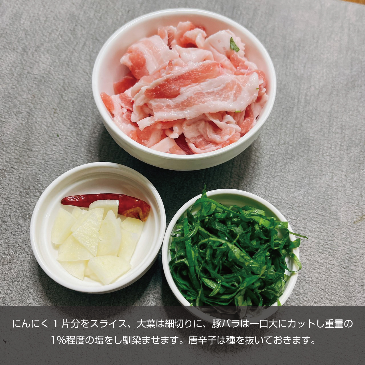 ①にんにく1片分をスライス、大葉は細切りに、豚バラは一口大にカットし重量の1%程度の塩をし馴染ませます。唐辛子は種を抜いておきます。