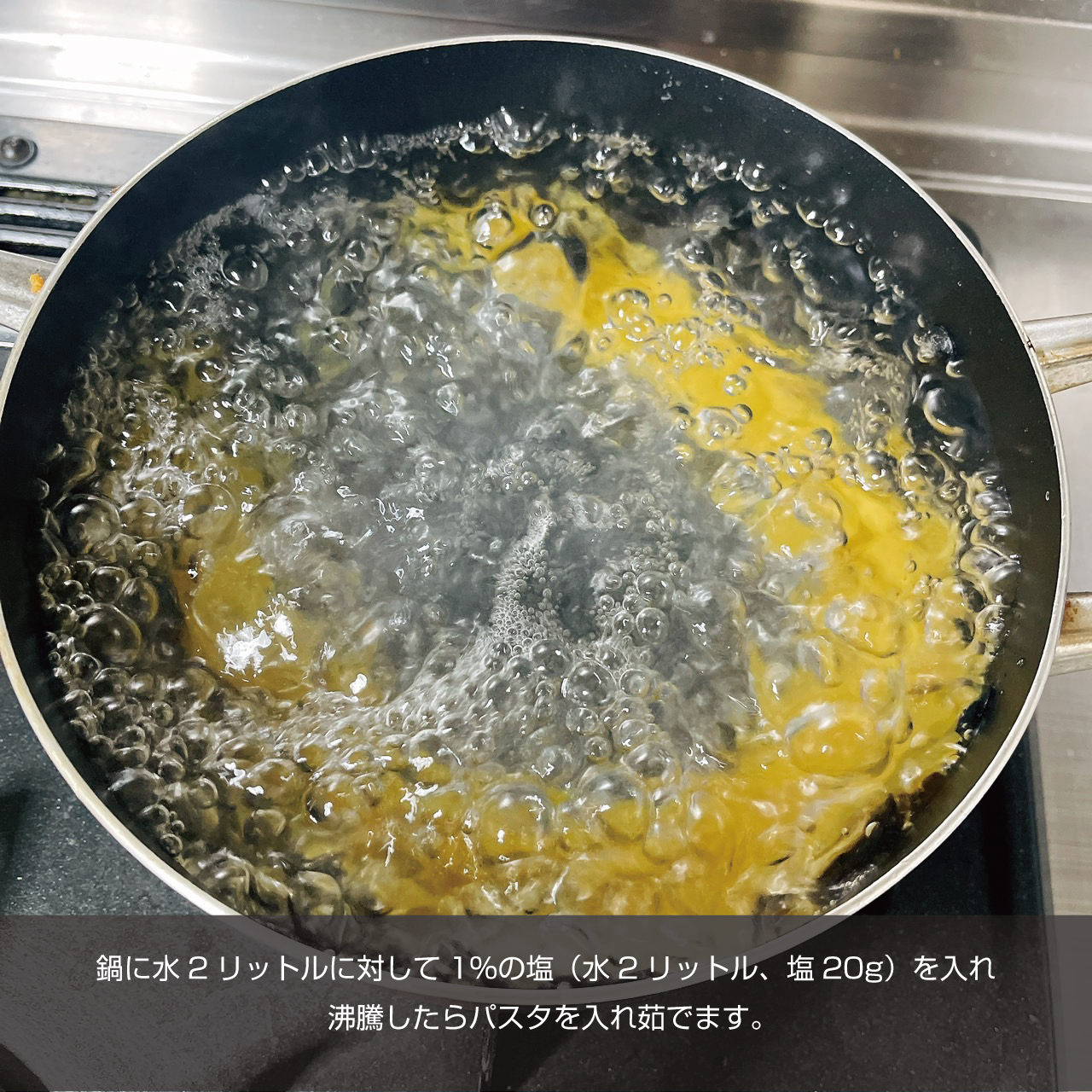 ②鍋に水2リットルに対して1%の塩(水2リットル、塩20g)を入れ沸騰したらパスタを入れ茹でます。