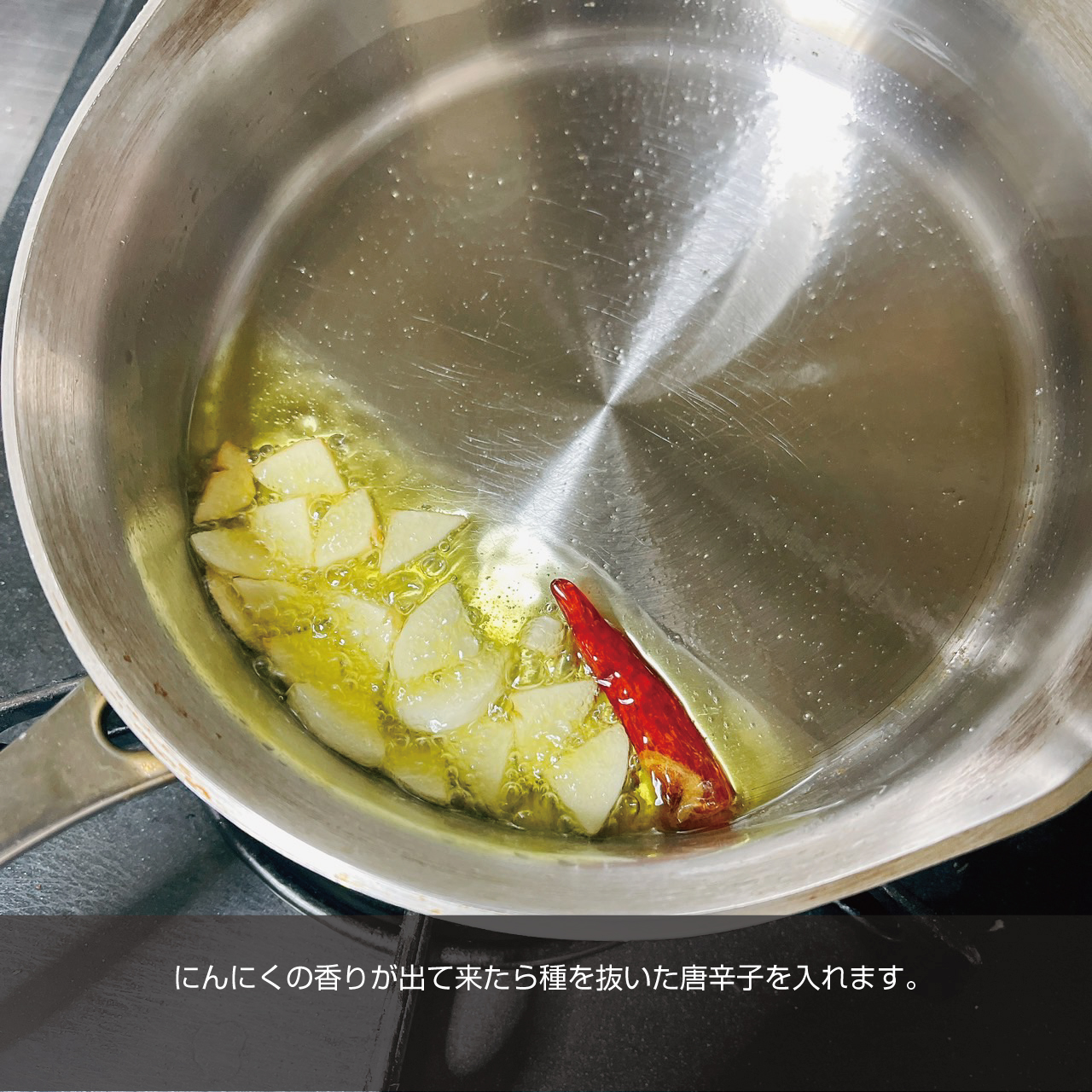 ③フライパンにオリーブオイル大さじ1弱、スライスしたにんにくを入れ弱火で火にかけ、にんにくの香りが出て来たら種を抜いた唐辛子を入れます。