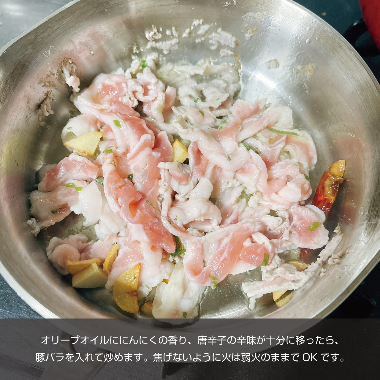 ④オリーブオイルににんにくの香り、唐辛子の辛味が十分に移ったら、豚バラを入れて炒めます。焦げないように火は弱火のままでOKです。