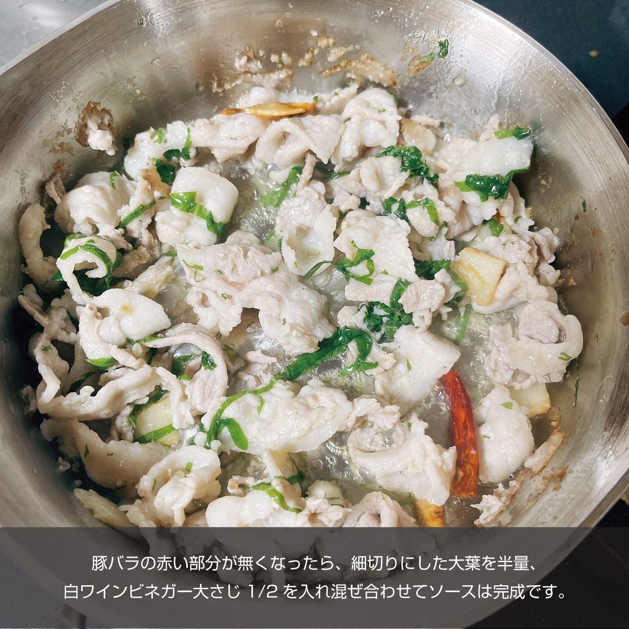 豚バラ肉を使うので脂で少し重たくなりがちですが、白ワインビネガーと大葉で脂感を軽減します。