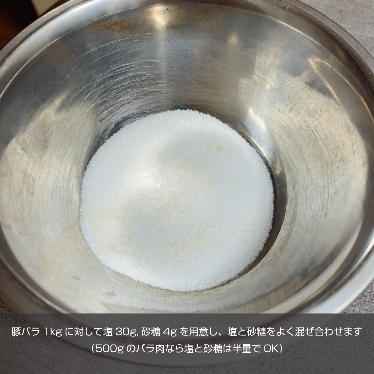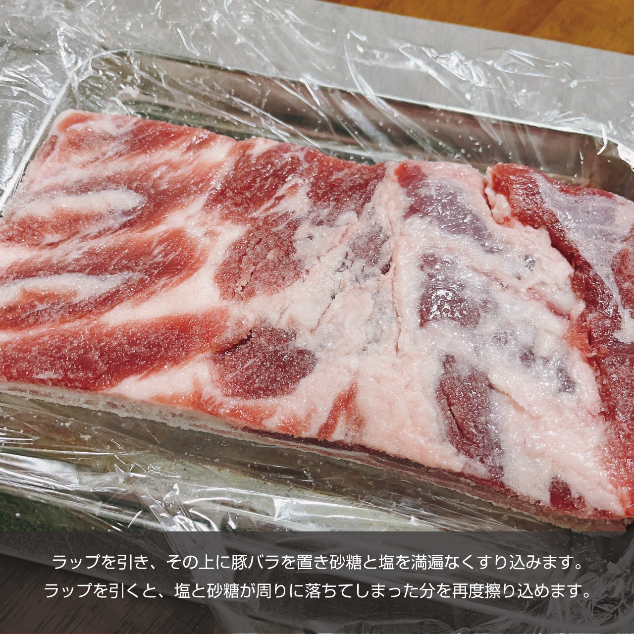 ① 豚バラ1kgに対して塩30g,砂糖4gを用意し、塩と砂糖をよく混ぜ合わせます(500gのバラ肉なら半量)ラップを引き、その上に豚バラを置き砂糖と塩を満遍なくすり込みラップで巻きます。