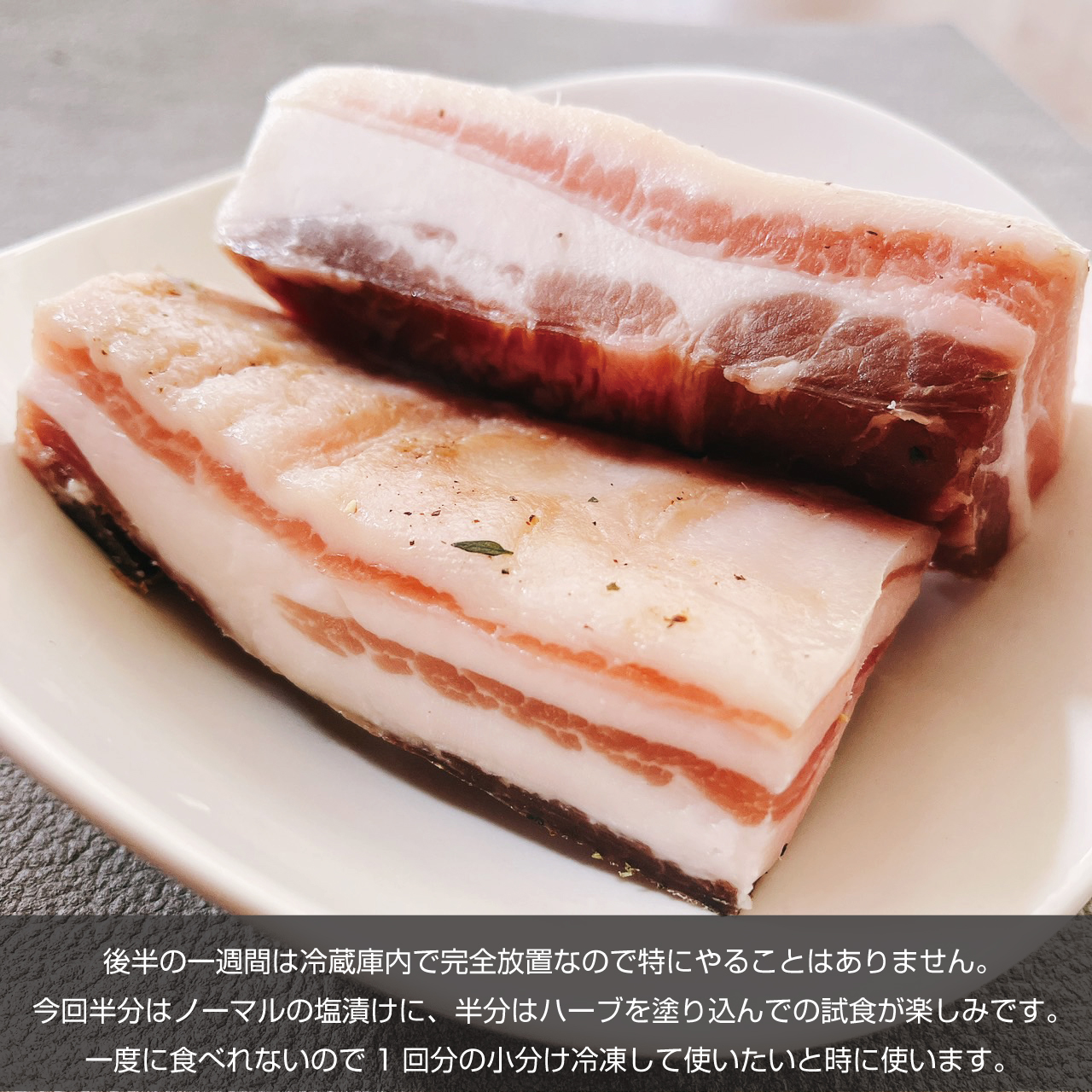 出来上がりまでは2週間かかり、初めの一週間で、豚バラに水分を塩と砂糖で抜き、後半一週間はひたすら冷蔵庫で乾燥させるという手順です。
