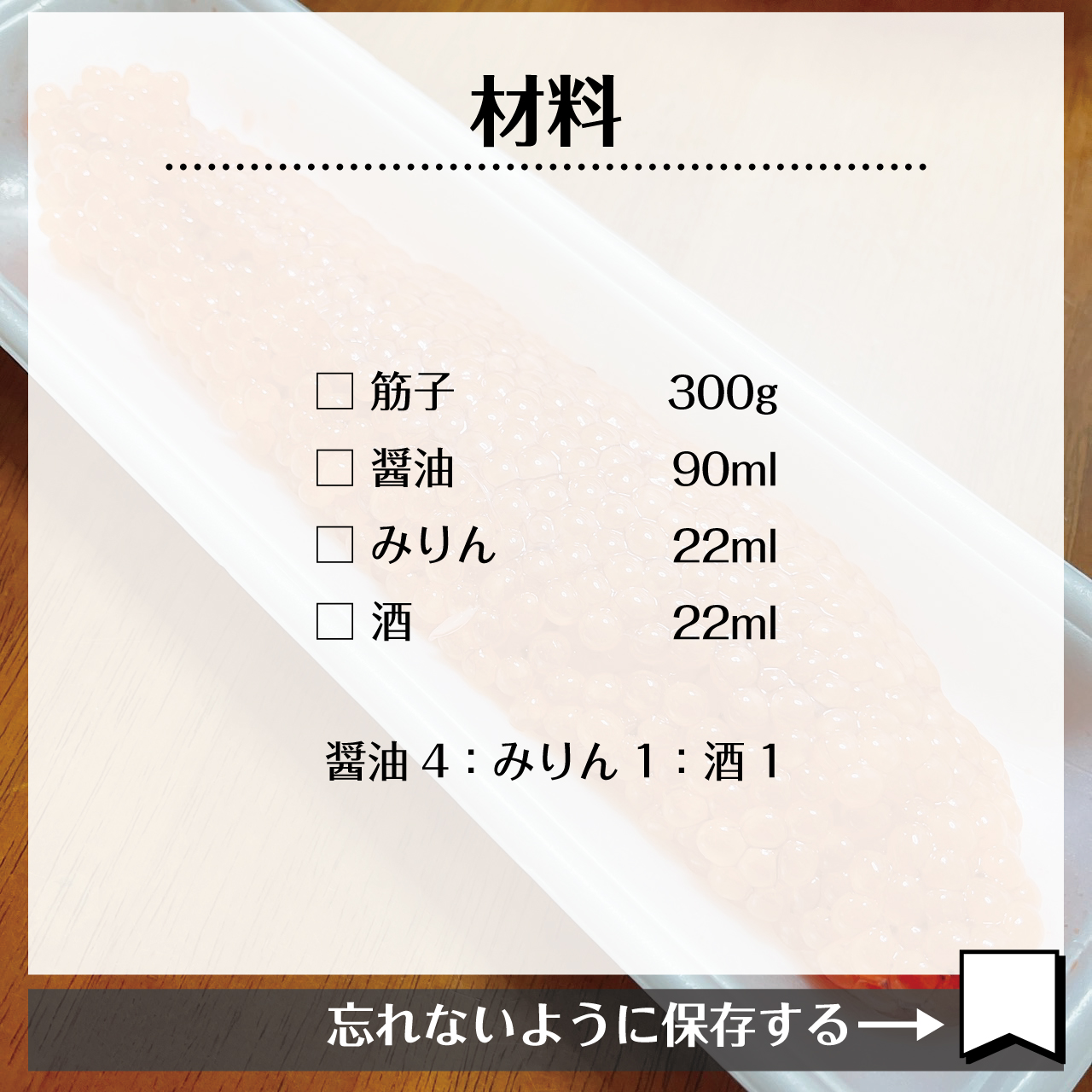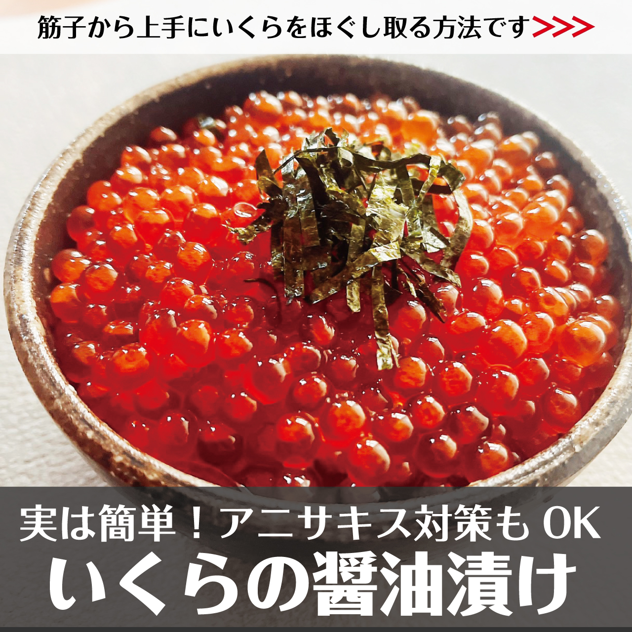 ※筋子にはアニサキスがいる事がありますが、60℃のお湯で1分加熱することで死滅するので、