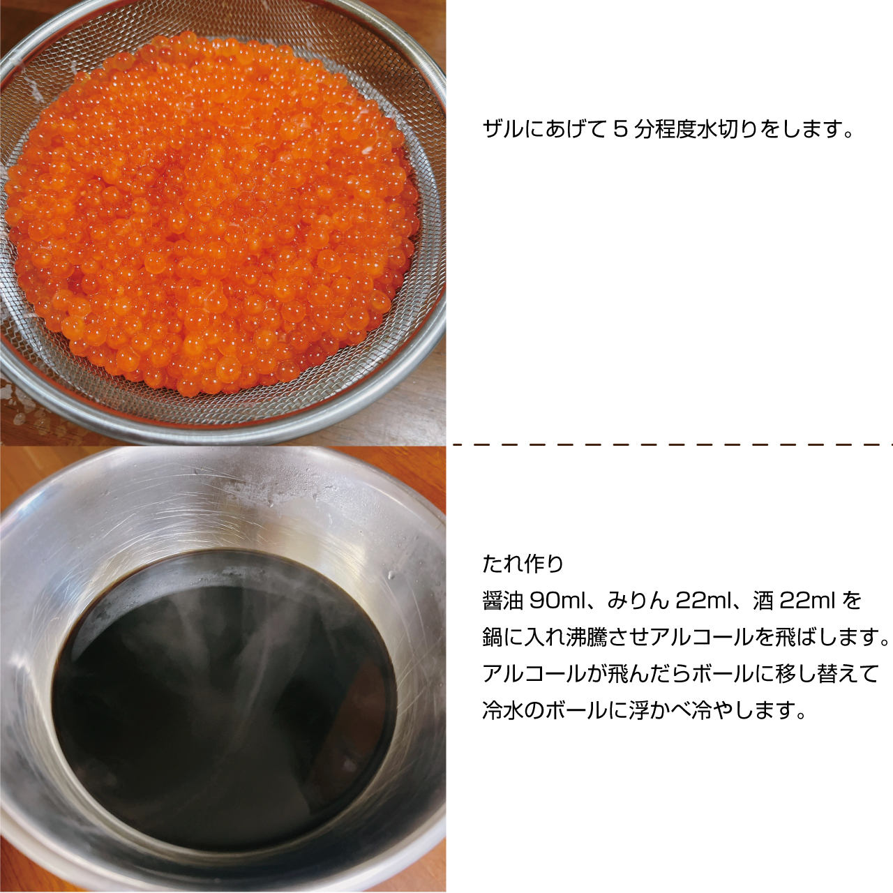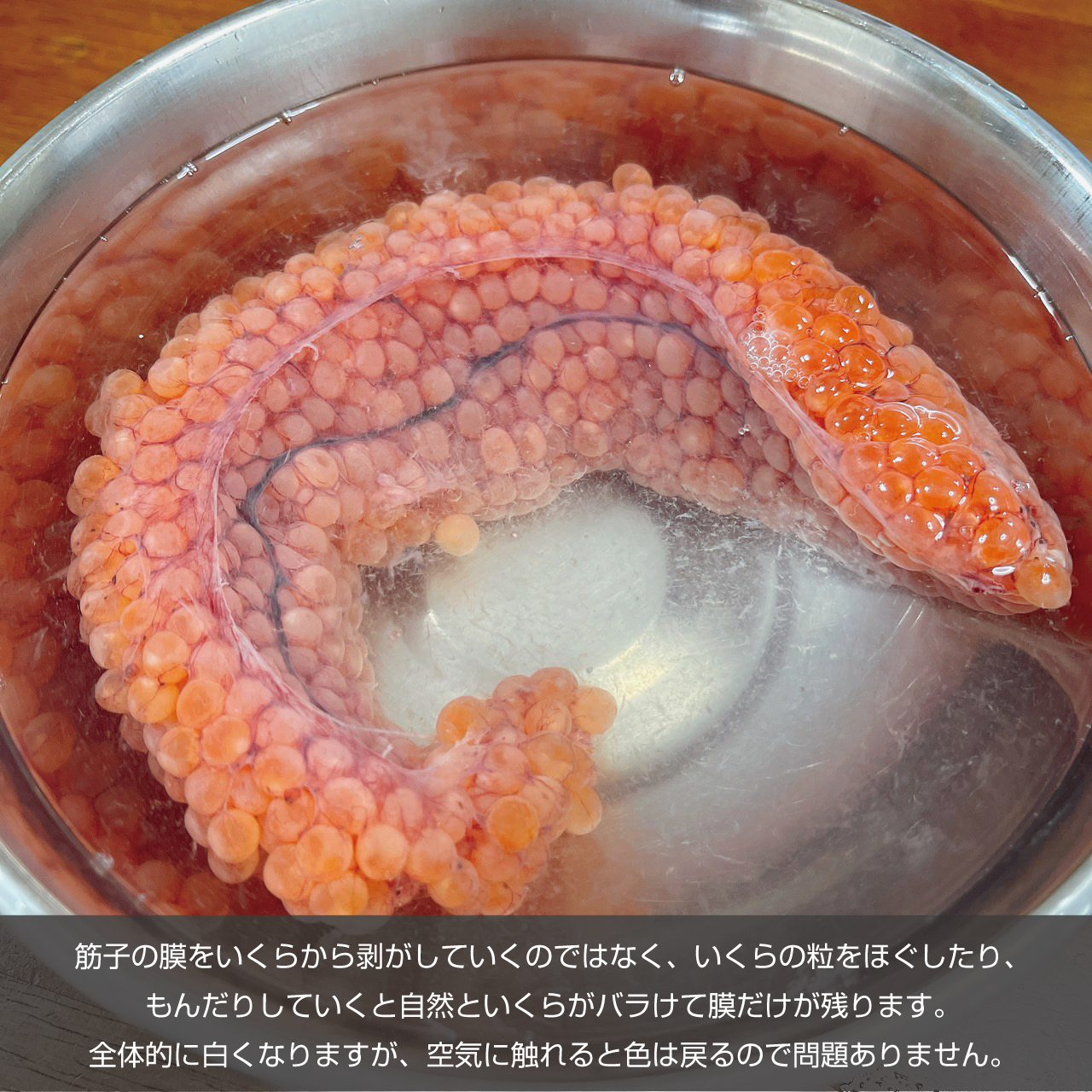 いくらをほぐしつつ、アニサキス対策もできるので60℃のお湯がポイントになります。