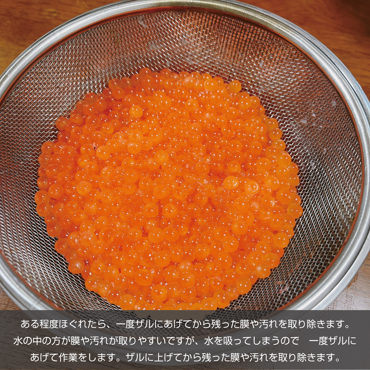 ②ある程度いくらがほぐれたら、一度ザルにあげてから残った膜や汚れを取り除きます。水の中の方が膜や汚れが取りやすいですが、いくらが水を吸ってしまうので、一度ザルにあげて作業をします。ザルに上げてから残った膜や汚れを取り除きます。