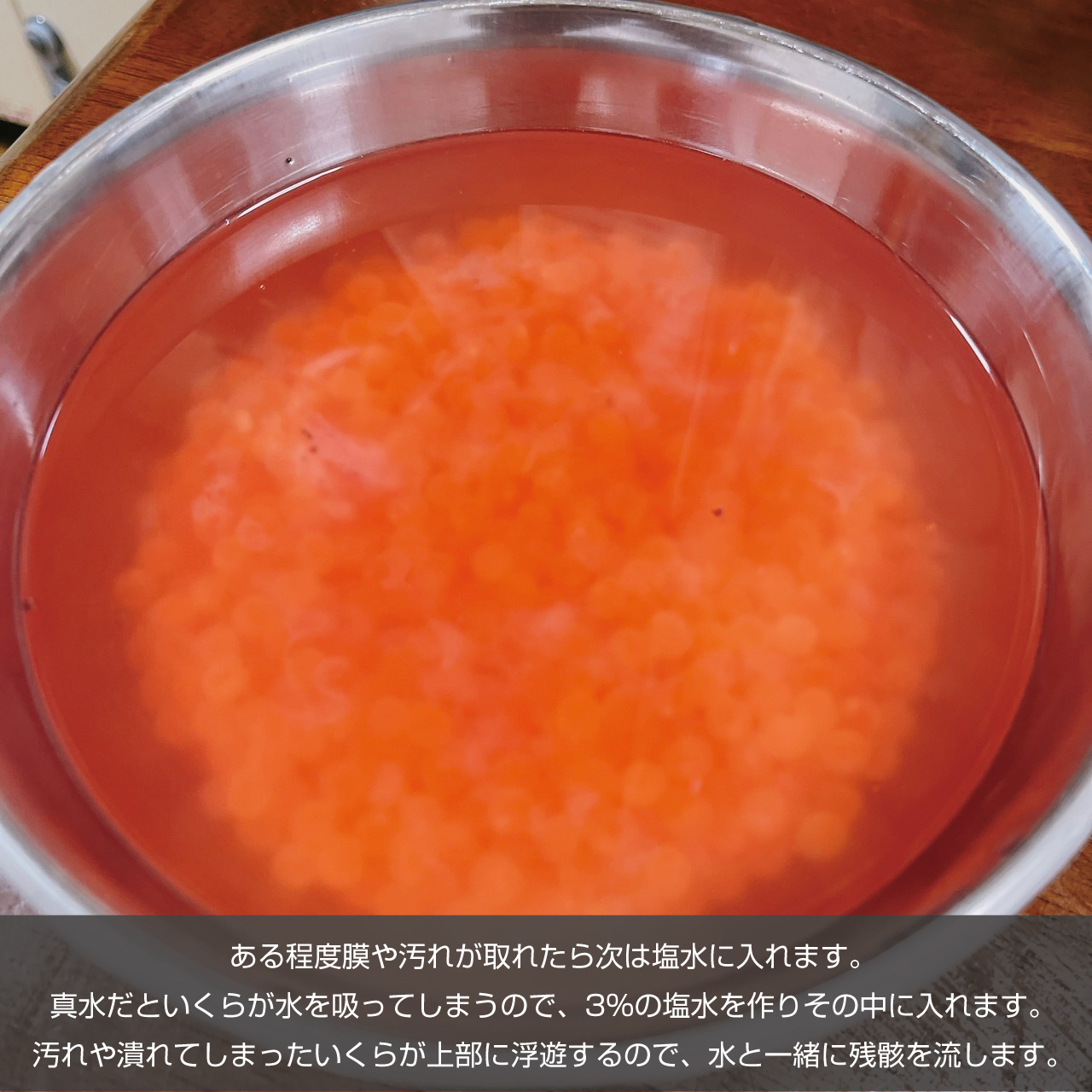 ③ある程度膜や汚れが取れたら次は塩水に入れます。真水だといくらが水を吸ってしまうので、3%の塩水を作りその中に入れます。そうすると汚れや潰れてしまったいくらなどが上部に上がってくるので、上部の水と一緒に残骸を流し、ザルにあげて5分程度水切りをします。