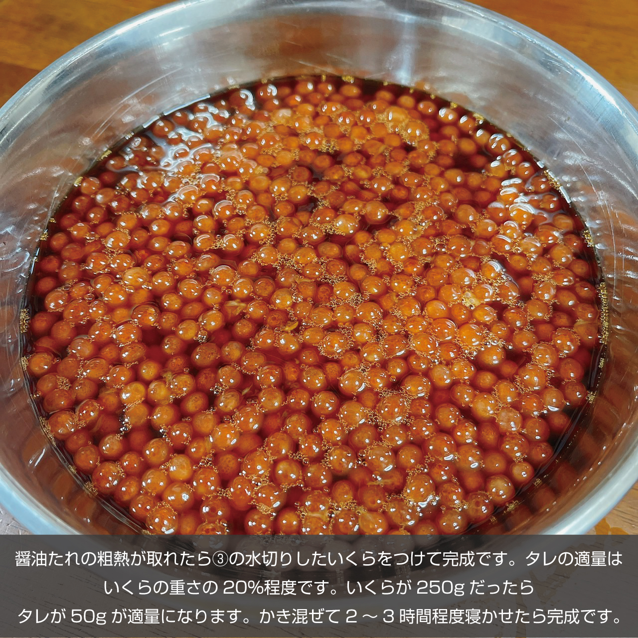 ⑤ ④の醤油たれの粗熱が取れたら③の水切りしたいくらをつけて完成です。タレの適量はいくらの重さの20%程度です。いくらが250gだったらタレが50g程度が適量になります。かき混ぜて2~3時間程度寝かせたら完成です。