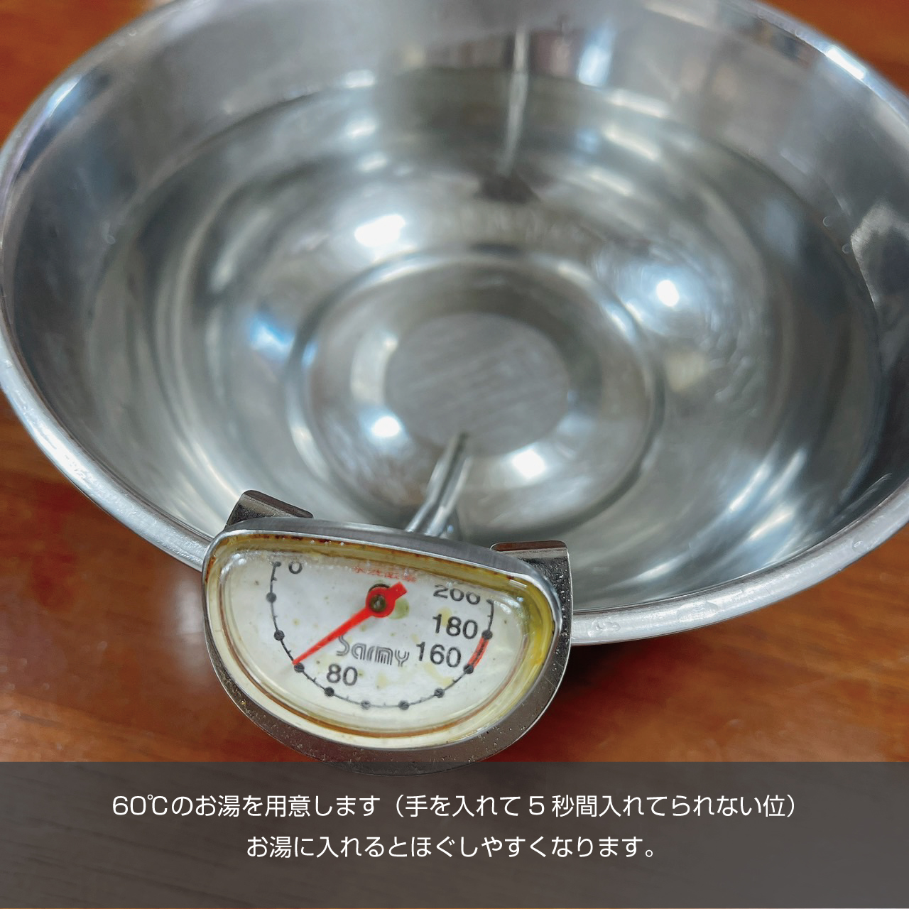 ①60℃のお湯を用意します(手を入れて5秒間入れてられない位)筋子を60℃のお湯に入れるとほぐしやすくなります。この時、筋子の膜をいくらから剥がしていくのではなく、いくらの粒をほぐしたり、もんだりしていくと自然といくらがバラけて膜だけが残ります。