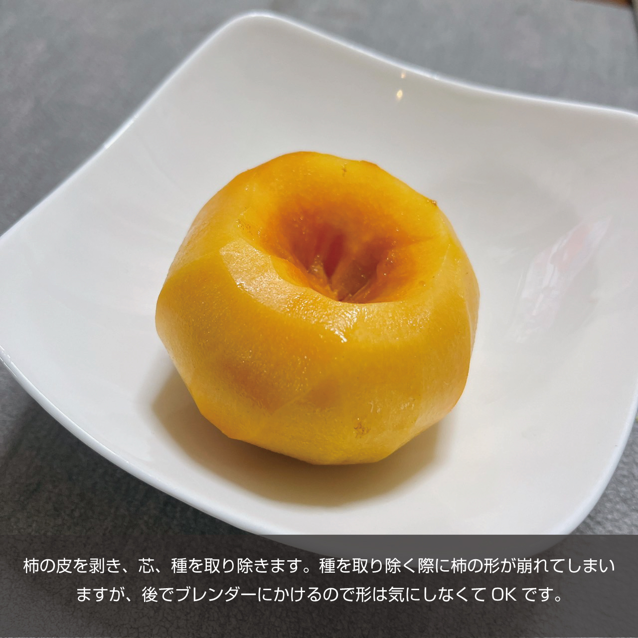 ①柿の皮を剥き、芯、種を取り除きます。ブレンダー又はミキサーにかけられる大きさに適当に切ります。後でブレンダーにかけるので形は気にしなくてOKです。