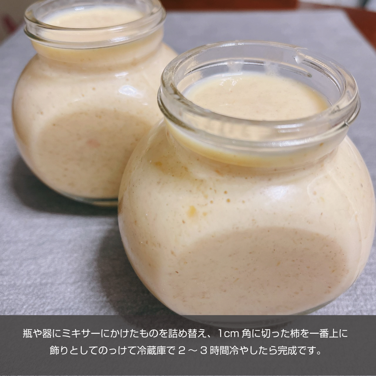 ④瓶や器にミキサーにかけたものを詰め替え、1cm角に切った柿を一番上に飾りとしてのっけ、冷蔵庫で2~3時間冷やしたら完成です。
